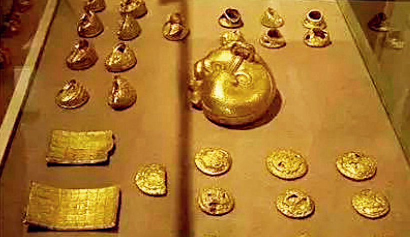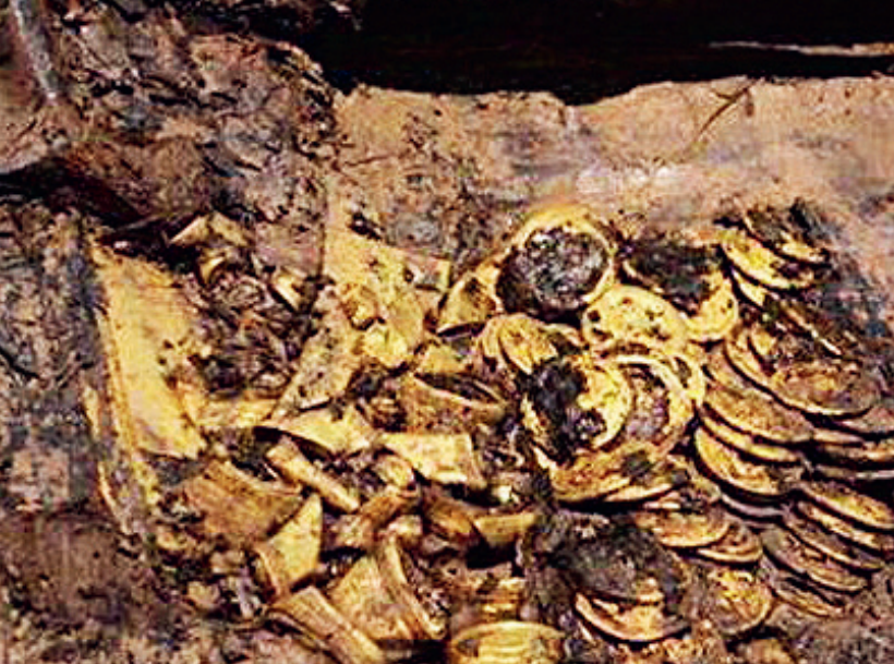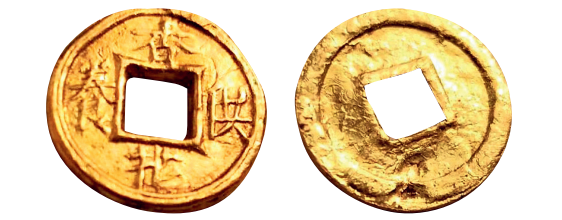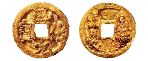 自战国始,黄金逐步替代珠玉、龟甲成为“上币”,主要用于皇室贵族间的朝聘、赏赐以及大宗交易的支付。当时的黄金货币主要有楚国的版金,又称“印子金”,上有“郢爰”“陈爰”等戳印。除此之外,还有几种用黄金铸成圆饼状的饼金,以及马蹄状、麟趾状的马蹄金和麟趾金。但这些都不参与流通,且大多带有通灵谶纬的意涵。1982年,江苏盱眙南窑庄窖藏出土了郢爰11块、马蹄金15块、麟趾金10块,总计11公斤。2015年,江西南昌海昏侯墓更出土了饼金、马蹄金、麟趾金共378枚,是迄今为止通过考古发现金币数量最多、种类最全的一次。汉魏时期的金质方孔钱,目前发现有汉代的“金质五铢”以及北魏道武帝拓跋珪铸造的“金质天兴七年”等钱,虽然数量不多,但性质显然属于“宫钱”。唐代的金银货币有金银铤,作为次要的支付和储藏手段,主要用于税赋、捐献、赏赐、军政开支等方面。