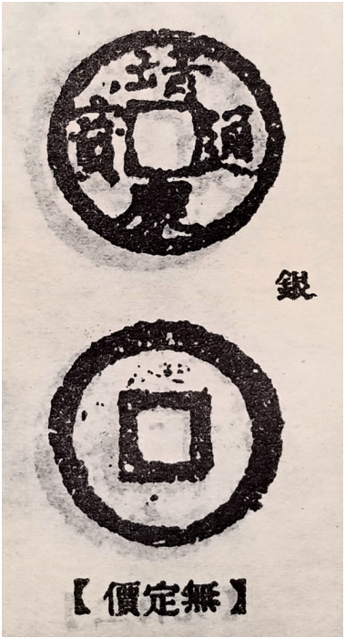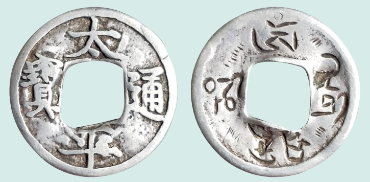 另外,笔者也珍藏有一枚太平通宝背阴刻藏文银质宫钱。其直径2.3厘米、厚0.11厘米、穿径0.69厘米,重2.3克。正面“太平通宝”四字为瘦金体,背面阴刻四字藏文,读为嗡、班扎、咕噜、贝玛。藏文的写法在文字结构上略有调整以适应整体布局,含义分别是:嗡,语首发音词不译;班扎意为金刚;咕噜意为上师;贝玛为莲花,合起来为金刚上师莲花之意。这枚钱发现于今内蒙古自治区化德县。据考,在宋代“藏文”为蒙古与吐蕃地区的通用文字,说明宋王朝与各民族交流互鉴密切,此钱或为赏赐后经佛教信众供养传世也未可知。