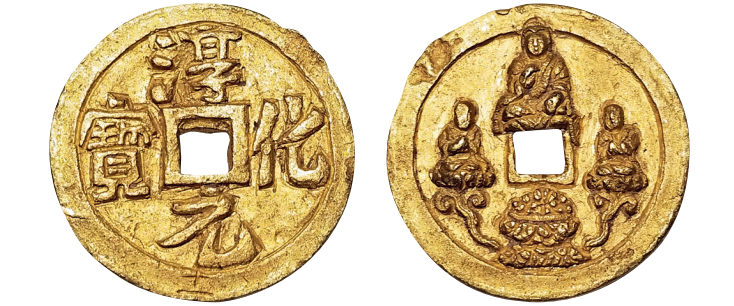 1988年春,五台山修塔时在地宫发现了一批淳化佛像金钱,钱径2.4厘米、穿径0.5厘米、厚0.12厘米,重12克左右,成色在90%以上。其面文“淳化元宝”行书乃宋太宗御书,背佛像两尊,像下均有莲花宝座,背穿上砸印一二三四及无号者共五种。整体工艺采用先铸造后加刀錾刻,佛像开脸及袈裟细节均以錾刻表现,刀法犀利纯熟,佛像身躯自然流畅,眉目五官栩栩如生。这批淳化佛像金钱即宋代皇家供奉五台山寺庙的供养钱。据传,当时共出土1300余枚,后大部分流入香港,追索回约900枚,仍有数百枚流入民间。
