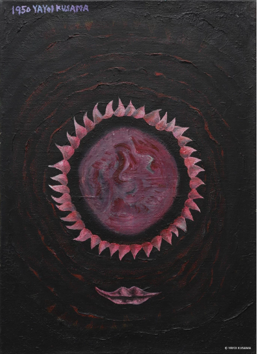 按时间顺序,第一幅是草间弥生的《自画像》(1950 年):一粒多刺的粉红色种子,一个永恒的胚胎细胞,一个开篇的句号,一个通向宇宙的发射台。作于21岁,这是草间艺术生涯之初的波尔卡圆点,表达出人与天体的连结。