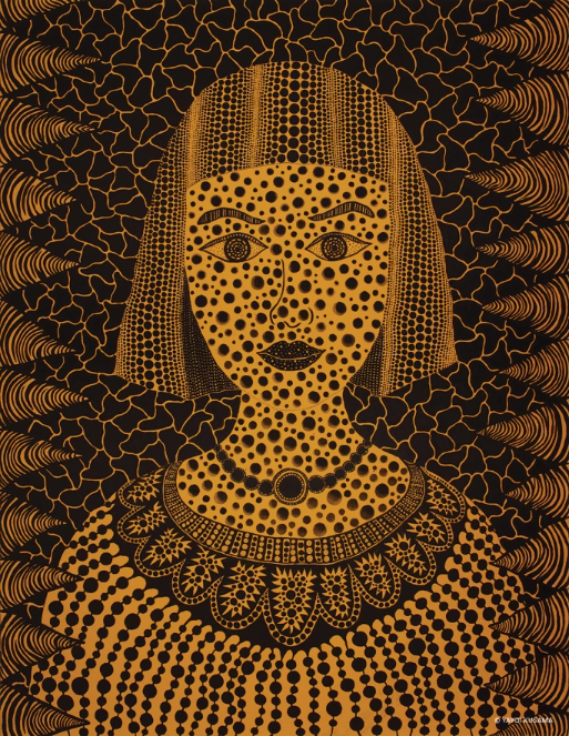 在这幅肖像中,草间弥生运用了醒目的色彩和破格的意象,彰示她古怪、调皮而鲜明的性格,就如柴郡猫(Cheshire cat) 消失后仍留在空气中的那抹淘气笑容。铜、黑二色与《南瓜》雕塑系列(1998至2000年)在视觉上呼应共鸣。她脸上和裙子上松散有致的圆点与她眼睛和嘴巴上密集细小的波点相映成趣。她的裙子和项链洋溢着部落、民族和五行色彩。作品敞开一扇窗,让观者窥探草间弥生真实的自我——作为广大宇宙之一员,也作为享誉国际的艺坛大师。草间弥生1971年曾言:「当我们将大自然和身体消融在无穷无尽的圆点中,我们便与身处的环境融而为一……我们消融在爱之中」。