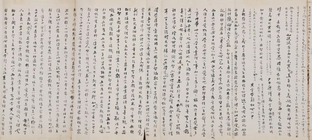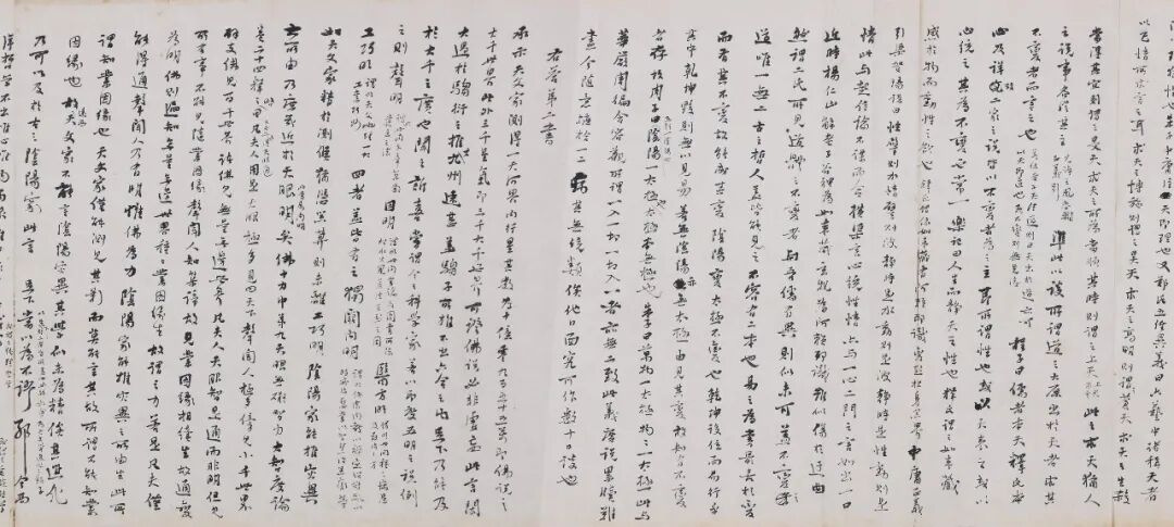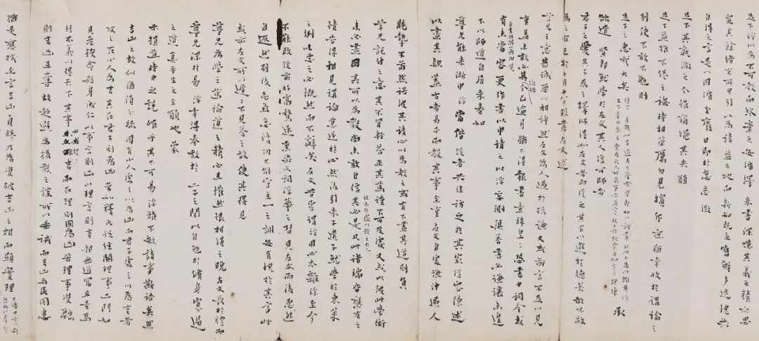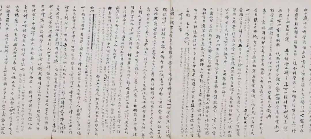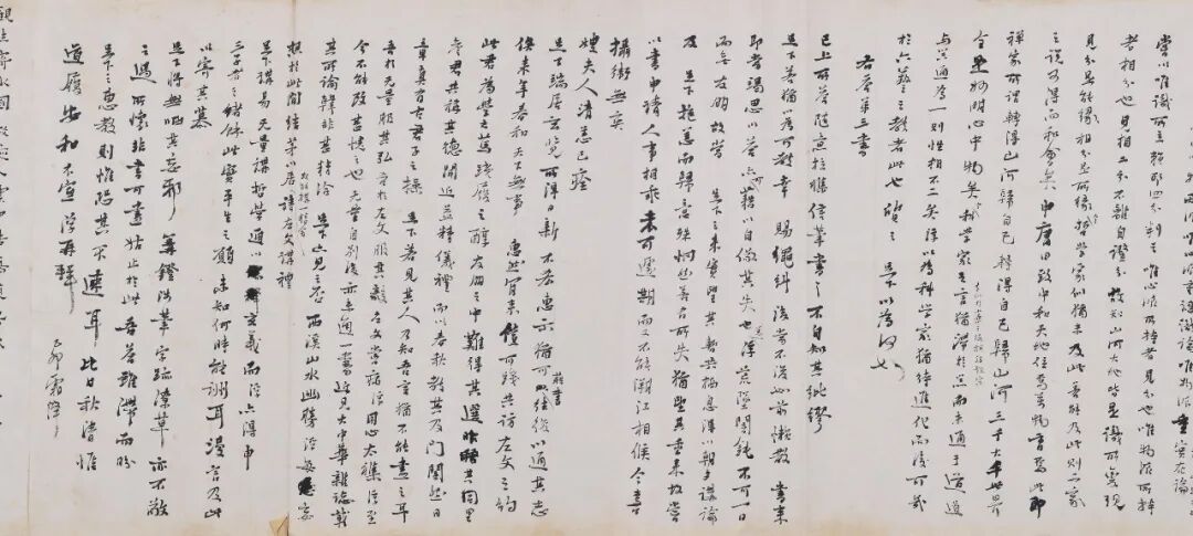 今秋拍卖,呈马一浮、谢无量在1915至1916年间致曹赤霞手稿长卷。卷中集马一浮致曹赤霞信札五通,谢无量致曹赤霞信札一通。卷长五米有余,内容博涉多广,探及儒学、佛学、诸子百家、西方哲学、科学,及数首自作诗歌,文中行、楷书兼有,计八千余字,叹为观止!1915年,马一浮33岁,在此之前,已是诗词、著作、译作颇丰。19岁的马一浮与谢无量、马君武等共同创立“翻译会社”,发行《二十世纪翻译世界》杂志及翻译作品单行本,译有西方《哲学史》、《哲学泛论》、《社会学》、《社会主义》、《宗教进化论》、《政治学史》、《政治泛论》、《法律泛论》、《最新经济学》、《教育史》等著;22岁结束留美转赴日本留学,携《资本论》英文本、德文本各一套回国;23岁译《唐·吉诃德》;24岁治国学,广阅三万六千四百余册《四库全书》,做了大量读书札记;25岁重译日文本《政治罪恶论》,改名《政诫》并做序;又研元曲,作《董解元<西厢记>记》、《<紫萧记>考》;26岁著《元钟继先<录鬼薄>跋》、《<曲苑珠英>序》、《重印严氏<全上古三代秦汉三国六朝文>序》,撰散曲《清汵序》十支等;28岁“贯缀前典,整齐百家”,撰巨篇《诸子会归总目例序》。32岁时表露将治伊洛之学;到此卷致曹赤霞信札的乙卯、丙辰年间,时已有《答程演生二首》、《香严翁赠长句以著书见期,敬答其意》、《啬庵书来,见和西溪诗,有春日重游之约,因书此简之》、《为潘法曹哭友》等友朋赠答诗多首,这一时期,存诗也已丰厚,部分辑入《蠲戏斋诗前集》。