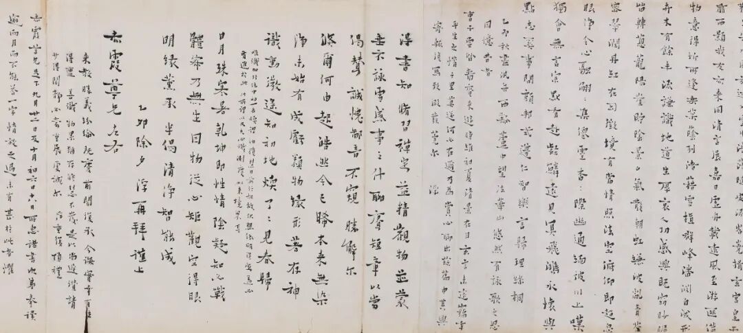 马一浮现今流传的墨迹,常见的多为三十至六十年代,此前的罕少。我们所见一张18岁时自题照片,背面为弱冠时跋文,此间笔墨脱于碑板,不名一体即已娴熟。逾十载,展观此卷湛翁而立之年时致子起的信札手迹,书风已自成一格。卷中书体风貌不一,年属“乙卯霜降答三书”、 “十二月十三日”作以行书,文中涉佛学、易经、老子、中庸、六艺、西方唯物论、天文、科学等门类。各类学科,多派理论,贯穿融合探讨,虽表为“集襍”之信笔,读之仍不禁令人拍案称绝。后者信中言及择师“左文”事宜并阐述对传统哲学的观点、心得。有学者认为,马一浮书法的最高成就在行书,其基本结构出自《圣教序》,借鉴朱熹之书意,更参以篆隶、北碑之气韵,结体略呈斜紧,方笔间出,从而形成一种茂密峻爽、气韵潇洒之风,别有蕴藉遒健之美。更有甚者誉为“创造性学王的典范”。