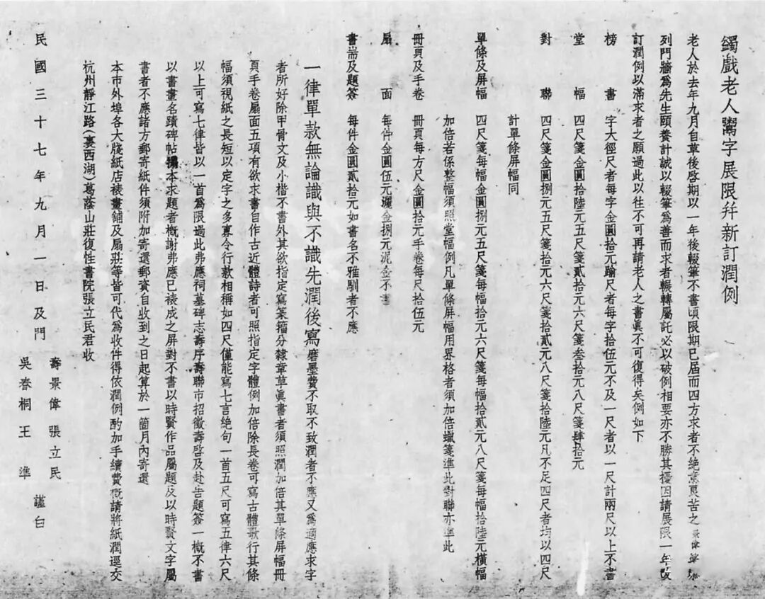 言及书法,马一浮终身临池不缀,卓然成家,当时已享有盛名。一九三三年,蠲翁作《蠲戏老人鬻书约》,砚田所入,足以治生。办复性书院期间,欲筹款刻书,鬻字“稍取润笔之资,移作刻书资费”,不及两月获三万元,结果如所愿。次年,书院停顿,又作《蠲戏斋鬻字改例启》,后数次修改润例,求墨者络绎不绝,名重文坛。沙孟海曾撰文说:“我们展玩马先生遗墨,再检读他《润戏斋题跋》,可以全面了解他对历代碑帖服习之精到,体会之深刻,见解之超卓,鉴别之审谛,今世无第二人。”曾受马一浮亲授的丰子恺服膺马先生的学问人品和书艺,推崇为“中国书法界的泰斗”。