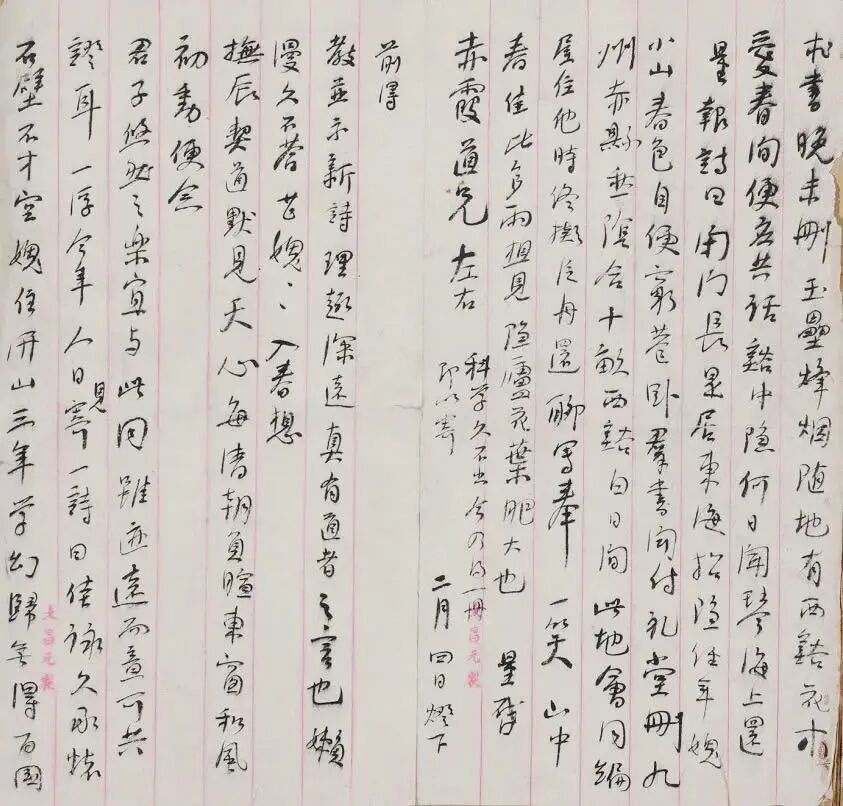 远揖佳篇,瞑通滕寄,惟彼山川之美,信符仁智之乐,虽节邻之願有待于具绿而开迳之望,弥轸于昨梦,聊兴短句敬远重来并报啬庵,同其佇想。浮再拜,赤霞足下,丙辰(1916)春风后二日。