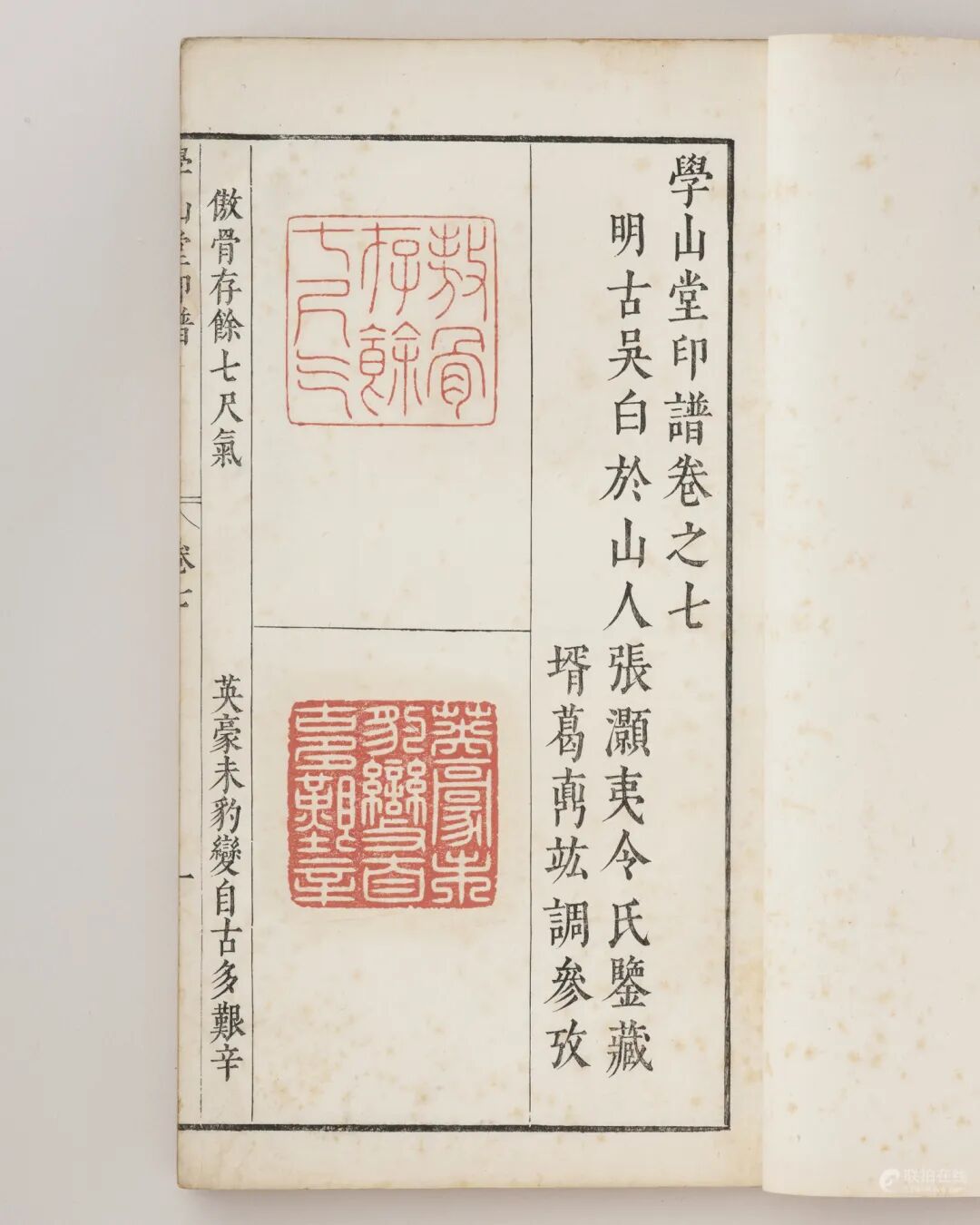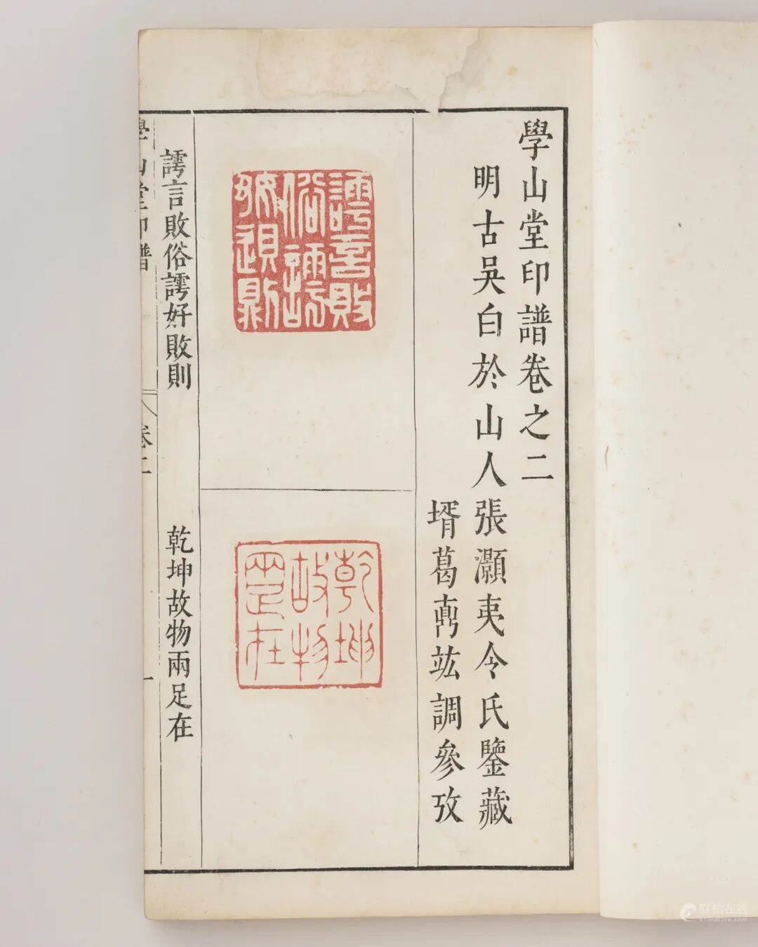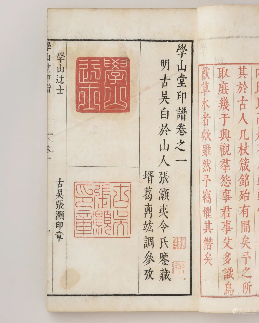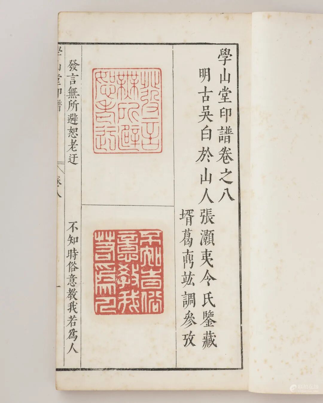 发行:「顾氏旧藏印谱目录」<长安庄江藤涛雄>No.2鉴藏家简介:瞿西塘,清末吴淞(今属上海)人,收藏家,活跃于同治、光绪年间,曾创「吴淞八景」。张灏,字夷令,一号学山长,斋号为学山堂,明末太仓(今江苏太仓)人。张灏嗜好篆刻,曾大量收藏当时篆刻家的作品。该印谱收录当时篆刻家作品数达两千余方,每页2-4印,均附有释文,是明末篆刻艺术的集大成之作,被称为明清时期最为著名“三堂印谱”之首,在中国印学史上具有极高的地位,其它两谱是清代的《赖古堂谱》、《飞鸿堂印谱》。该藏品卷一首先是「学山堂印谱叙」,每卷标题为「学山堂印谱卷之某,明古吴白于山人张灏夷令氏鉴藏,婿葛鼒竑调参考」。民国年间,藏品经江藤涛雄「长安庄」流入日本,所附「长安庄」销售目录「顾氏旧藏印谱目录」中《学山堂印谱》售价400大洋。
