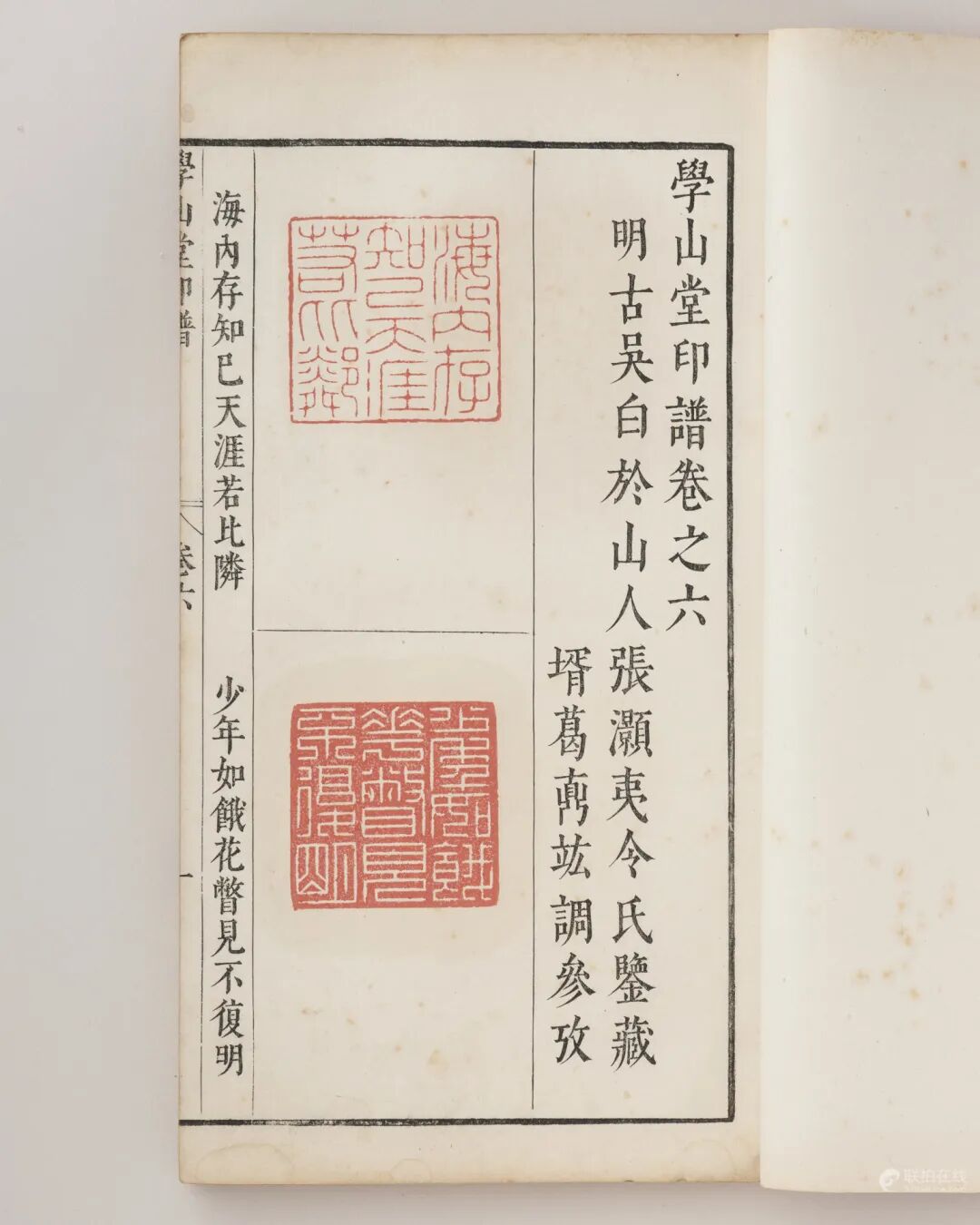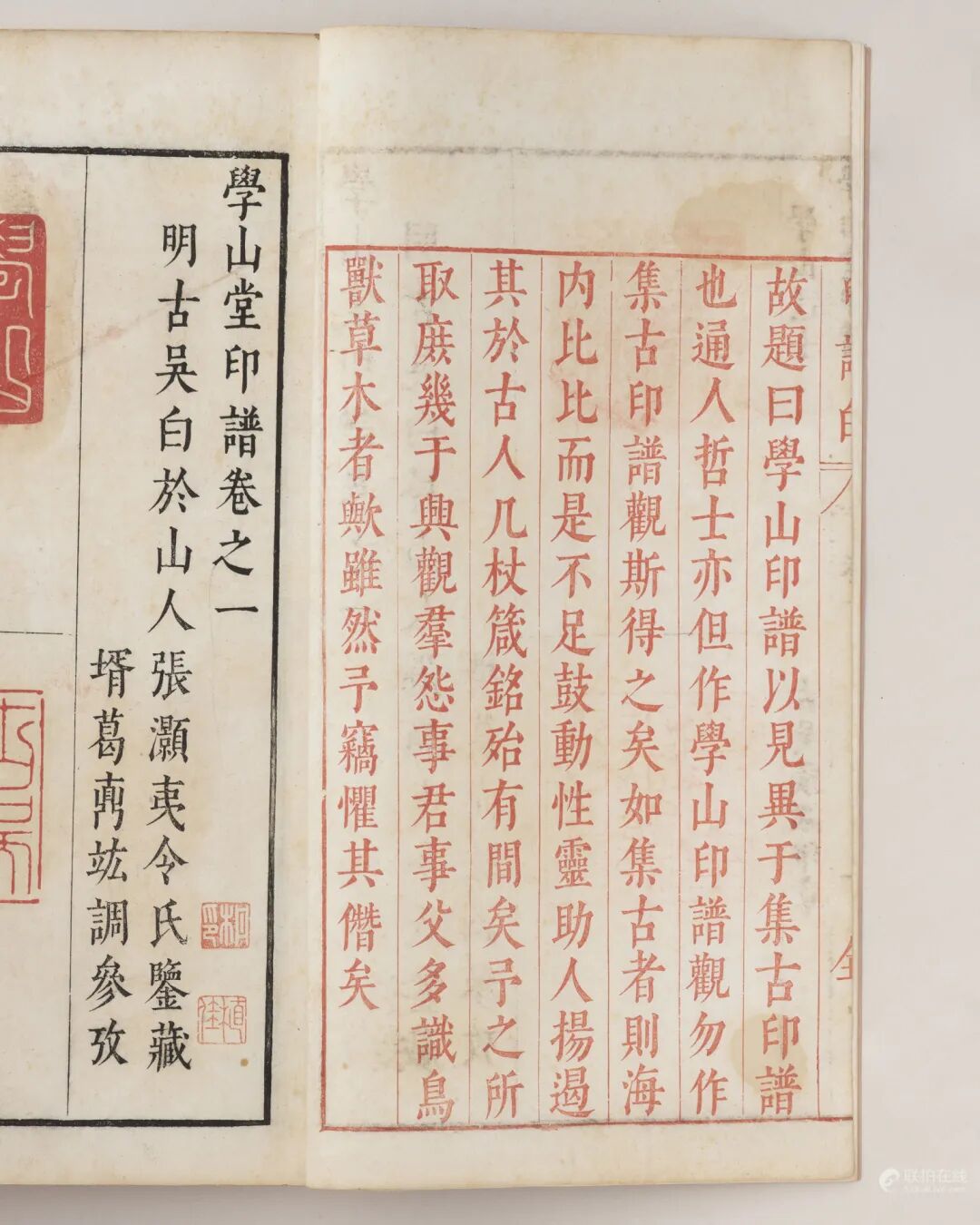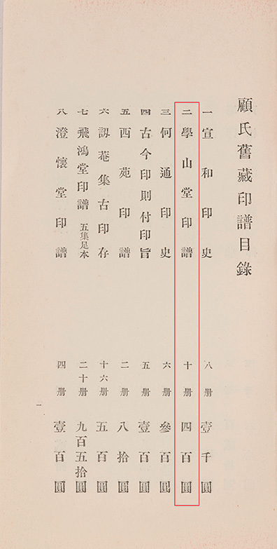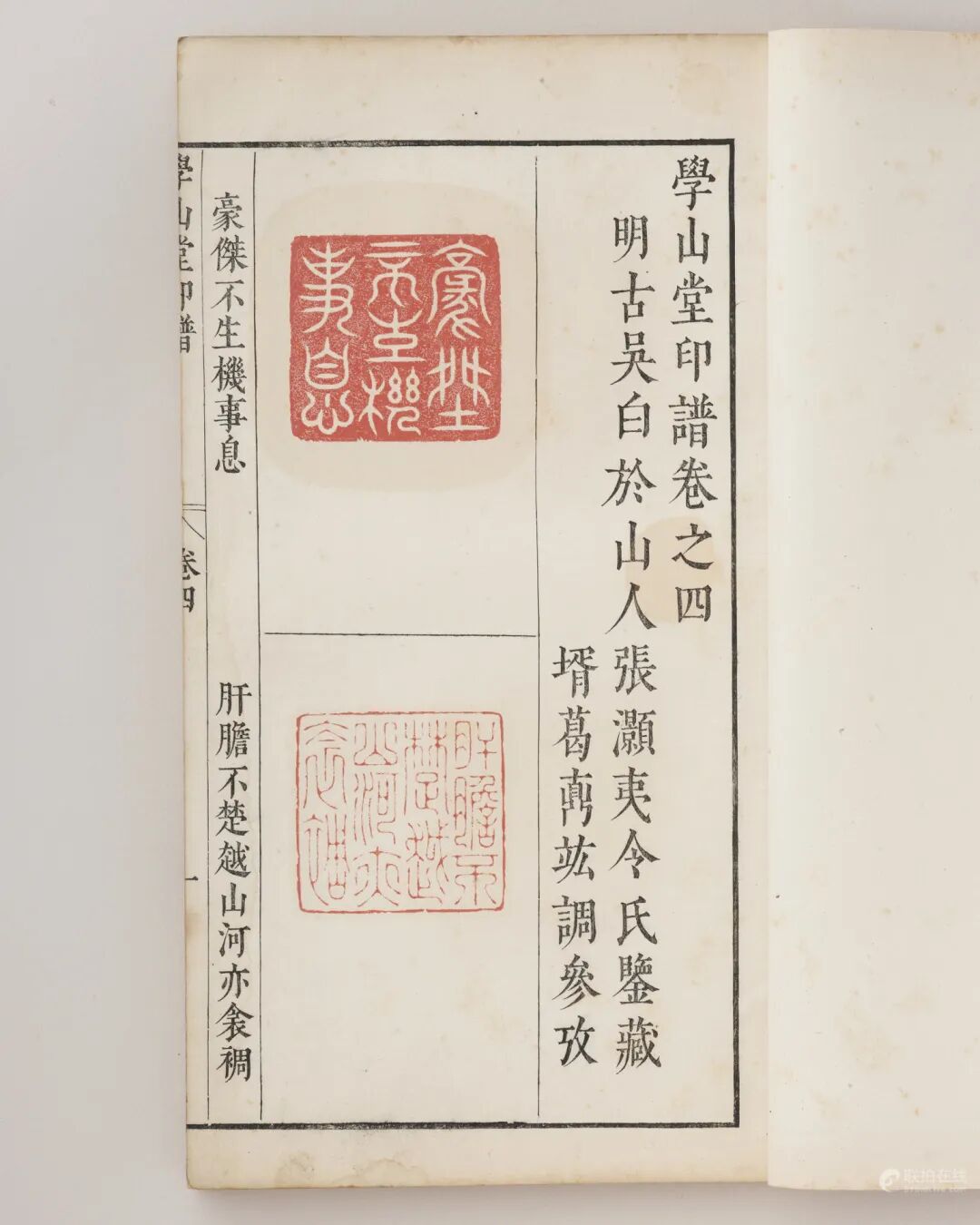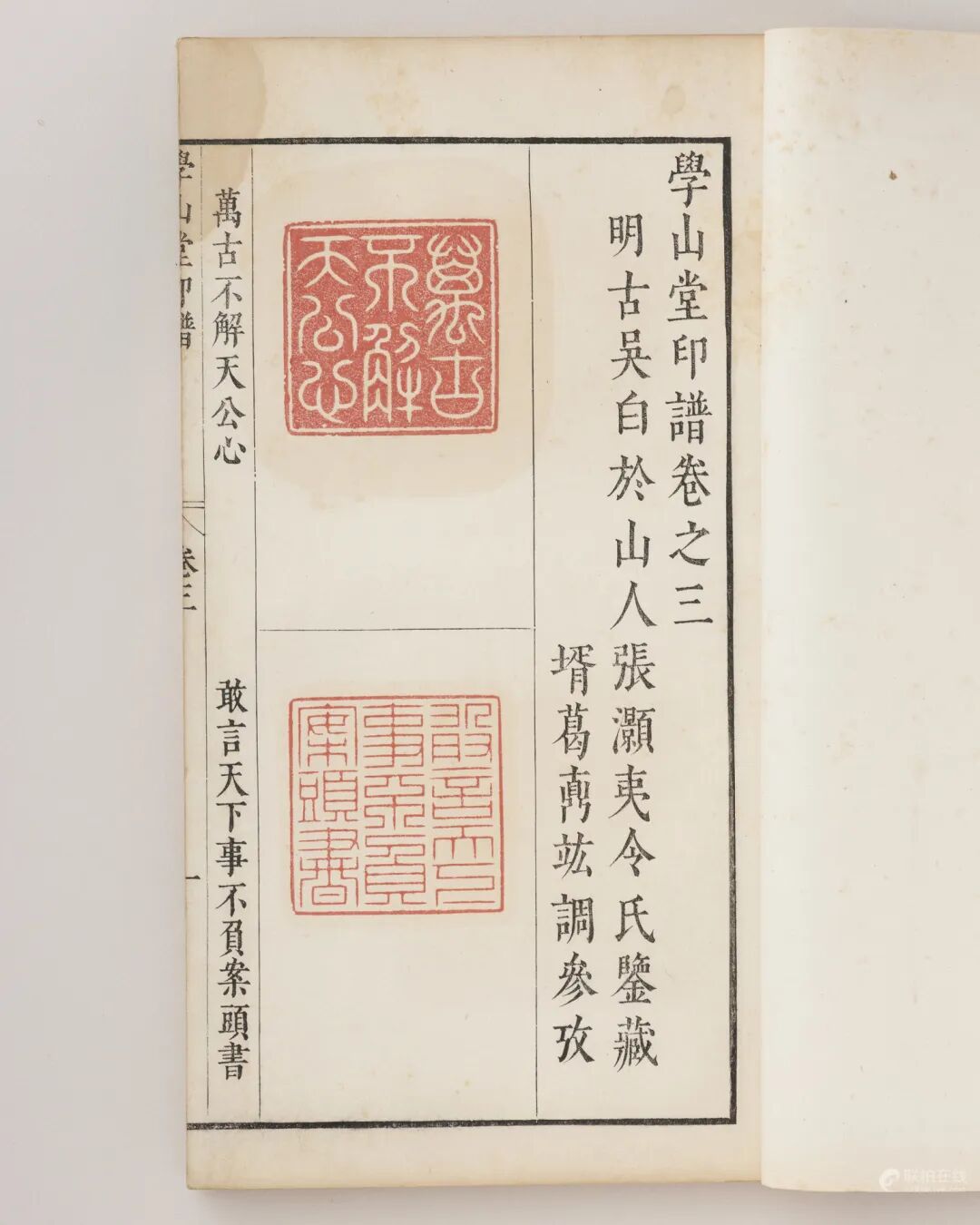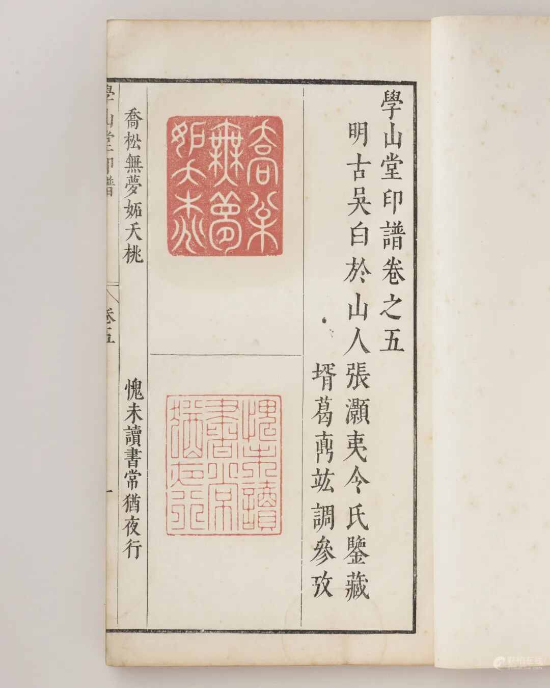 发行:「顾氏旧藏印谱目录」<长安庄江藤涛雄>No.2鉴藏家简介:瞿西塘,清末吴淞(今属上海)人,收藏家,活跃于同治、光绪年间,曾创「吴淞八景」。张灏,字夷令,一号学山长,斋号为学山堂,明末太仓(今江苏太仓)人。张灏嗜好篆刻,曾大量收藏当时篆刻家的作品。该印谱收录当时篆刻家作品数达两千余方,每页2-4印,均附有释文,是明末篆刻艺术的集大成之作,被称为明清时期最为著名“三堂印谱”之首,在中国印学史上具有极高的地位,其它两谱是清代的《赖古堂谱》、《飞鸿堂印谱》。该藏品卷一首先是「学山堂印谱叙」,每卷标题为「学山堂印谱卷之某,明古吴白于山人张灏夷令氏鉴藏,婿葛鼒竑调参考」。民国年间,藏品经江藤涛雄「长安庄」流入日本,所附「长安庄」销售目录「顾氏旧藏印谱目录」中《学山堂印谱》售价400大洋。