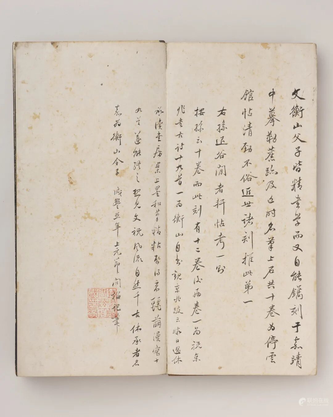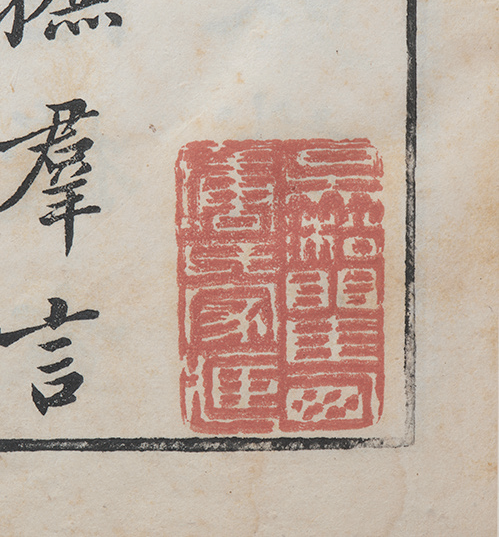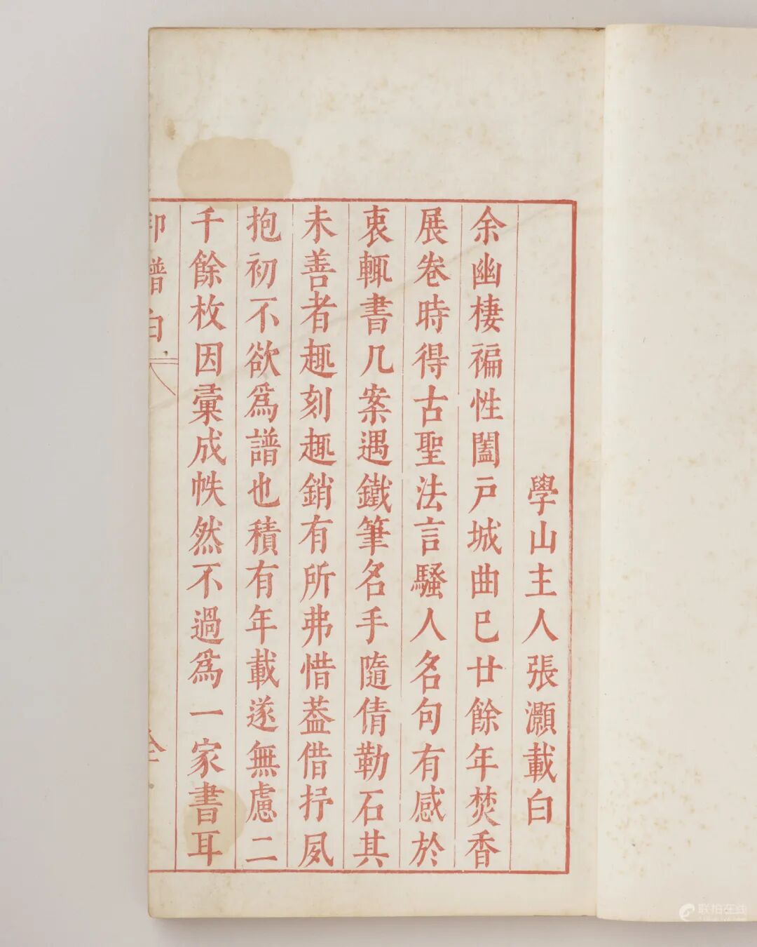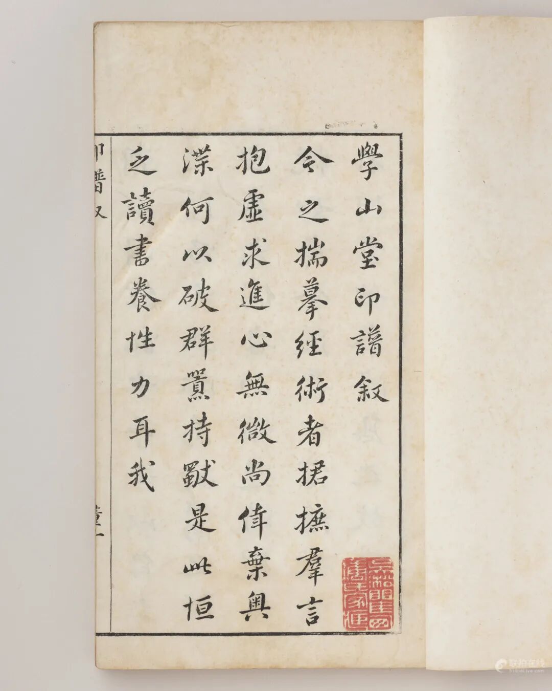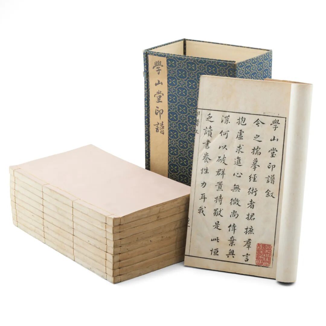 发行:「顾氏旧藏印谱目录」<长安庄江藤涛雄>No.2鉴藏家简介:瞿西塘,清末吴淞(今属上海)人,收藏家,活跃于同治、光绪年间,曾创「吴淞八景」。张灏,字夷令,一号学山长,斋号为学山堂,明末太仓(今江苏太仓)人。张灏嗜好篆刻,曾大量收藏当时篆刻家的作品。该印谱收录当时篆刻家作品数达两千余方,每页2-4印,均附有释文,是明末篆刻艺术的集大成之作,被称为明清时期最为著名“三堂印谱”之首,在中国印学史上具有极高的地位,其它两谱是清代的《赖古堂谱》、《飞鸿堂印谱》。该藏品卷一首先是「学山堂印谱叙」,每卷标题为「学山堂印谱卷之某,明古吴白于山人张灏夷令氏鉴藏,婿葛鼒竑调参考」。民国年间,藏品经江藤涛雄「长安庄」流入日本,所附「长安庄」销售目录「顾氏旧藏印谱目录」中《学山堂印谱》售价400大洋。