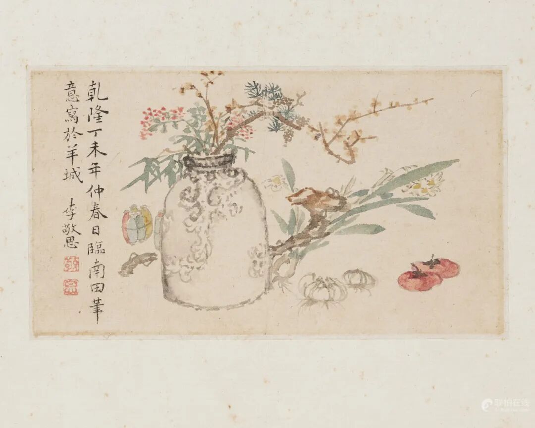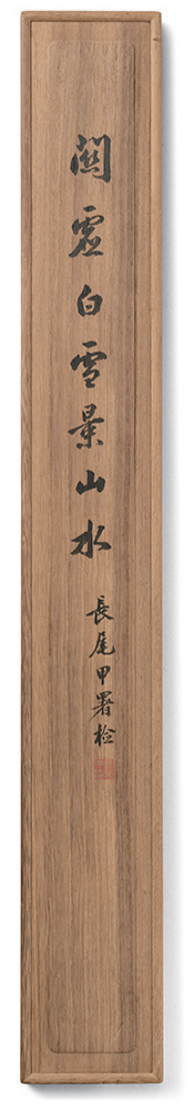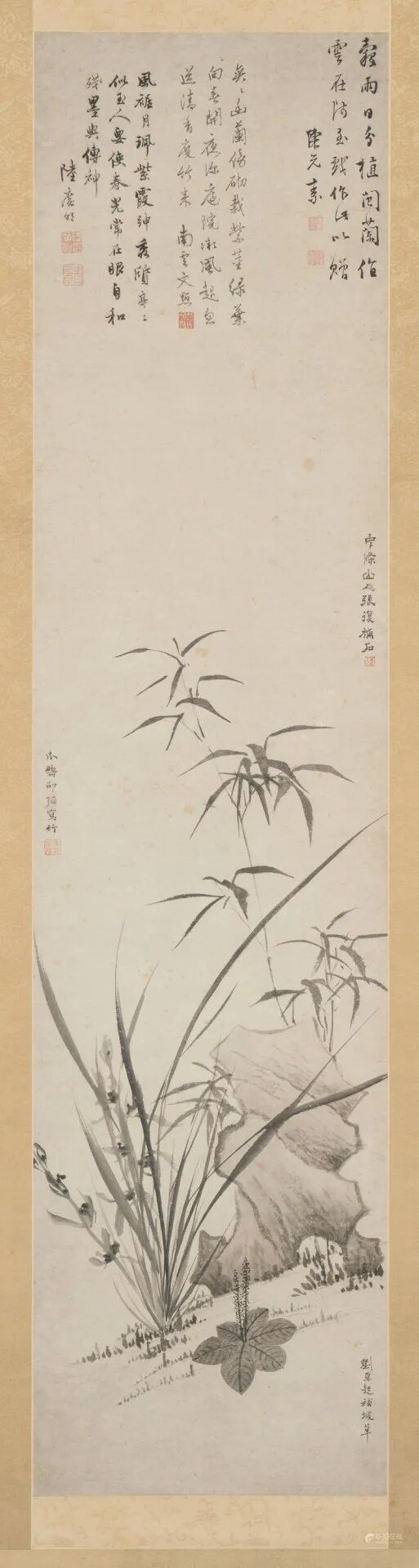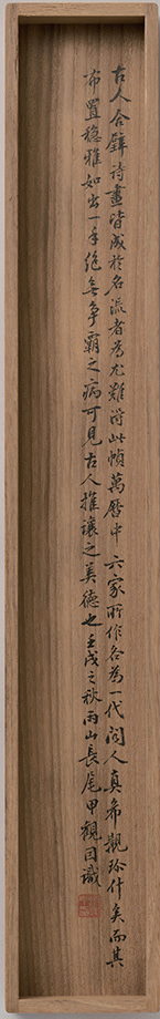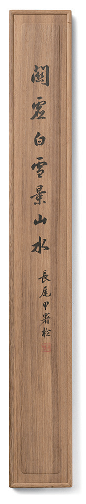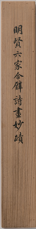 备注:明六家《书画合璧》陈元素、文点、陆广明、张复、邵弥、刘原起。①谷雨日,分植闽兰,值云在师至,戏作此以赠。陈元素。印文:陈元素印、陈氏孝平。②奕奕幽兰傍砌栽,紫茎绿叶向春开;夜深庭院凝风起,忽送清香度竹来。南云文点。印文:竺坞文点。③风裾月珮紫霞绅,秀质亭亭似玉人;要使春光常在眼,自和残墨与传神。陆广明。印文:陆广明印、青章。木盒内题记:古人合璧诗画,皆成于名流者,为尤难得。此帧万历中六家所作,各为一代闻人,真希觏珍什矣。而其布置稳雅,如出一手,绝无争霸之病,可见古人退让之美德也。壬戌之秋,雨山长尾甲观,因识。印文:長尾甲印。②文点,号南云山樵、竺坞山人等,长洲(今苏州)人,明末清初书画家,文徵明五世孙。③陆广明,长洲(今苏州)人,明末清初书画家。文徵明弟子陆师道之孙。④张复,号中条山人,苏州府太仓人(今江苏太仓),明末画家。题签者简介:長尾雨山(1864-1942),名甲,日本近代著名的汉学家、书画家、篆刻家,精于书画鉴别,与著名学者罗振玉、内藤湖南等交游甚密。