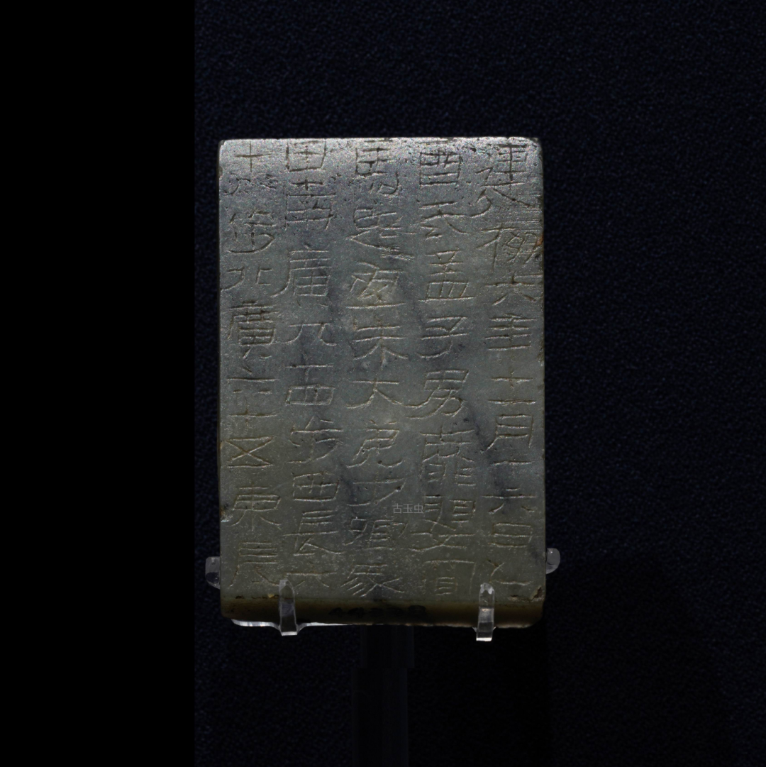 碧玉质,长方体形,无孔,正反两面均有阴刻隶书铭文。大意为公元81年靡婴购得这块墓地,并注明东南西北四至面积及见证人。此件地券传出自山西忻州,是迄今发现的唯一一件玉质买地券,也是已知东汉买地券中年代最早的。