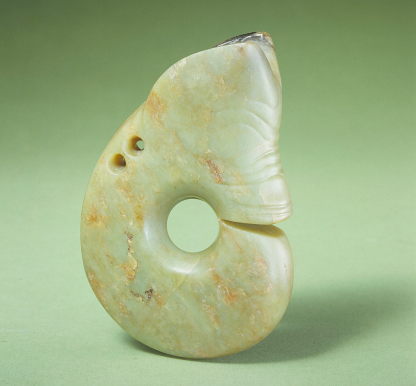 高15.4cm,宽10.5cm,厚4.5cm。新石器时代红山文化。玦以青黄色玉料制,表面有多处色斑。整体为环形,一侧有一开口,未断开。开口一端为兽首,另一端为兽尾,兽身屈而成环,颈部有二小孔。