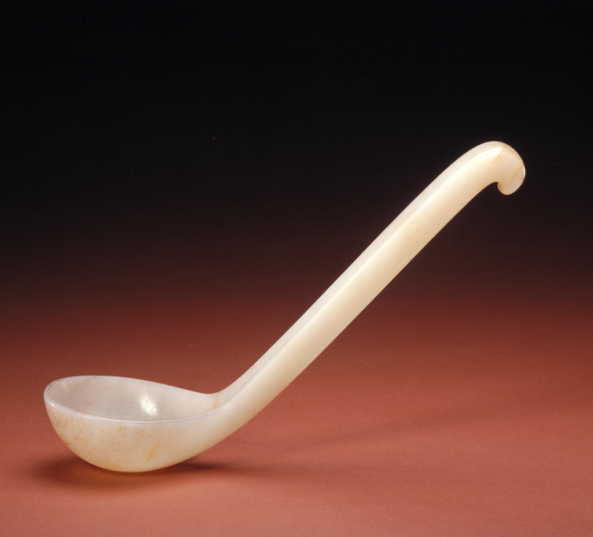 高2.8cm,长19cm,柄宽1.3cm,勺横径5.3cm。勺白玉质,玉质温润,打磨光滑,略有黄褐沁斑。直柄,柄首勾曲回卷,勺体较深。通体光素无纹饰。