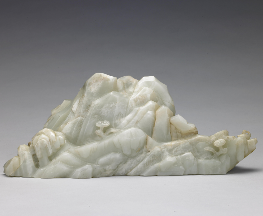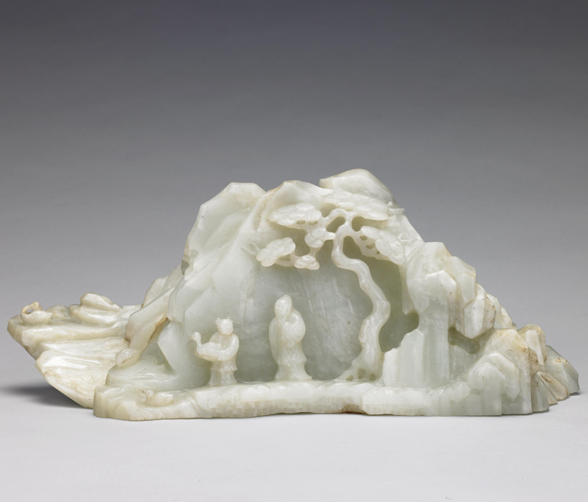 高12cm,宽28.5cm,厚9.4cm。青玉山体正面雕羲之爱鹅故事图像,背面岩石间点缀灵芝数枚、兰花数丛。清代山子因为体量相对较大,多采用新疆山料制作,以青玉居多。"