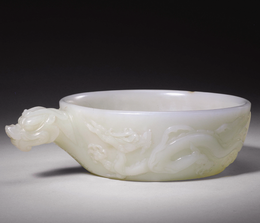 高4.9cm,口径13.9cm,底径10cm。白玉质,微闪青,圆口。外壁通体浮雕两条呈行进状态中的龙,龙身细长无鳞,皆四爪张开,呈车轮状。一侧以龙首作柄,龙张口吐舌,上下唇皆外翻。平底无足。
