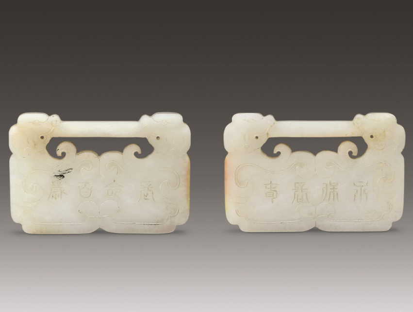 长12cm,宽8cm,厚3cm。带饰青白玉质,器表抛光精亮。器物在椭圆形环璧上,高浮雕4朵盛开的凌霄花,花枝交叉环绕。圆环背面凸起两桥形鼻纽,分别套连两椭圆环,环上为半月形托,托上浮雕蝶恋花图案。