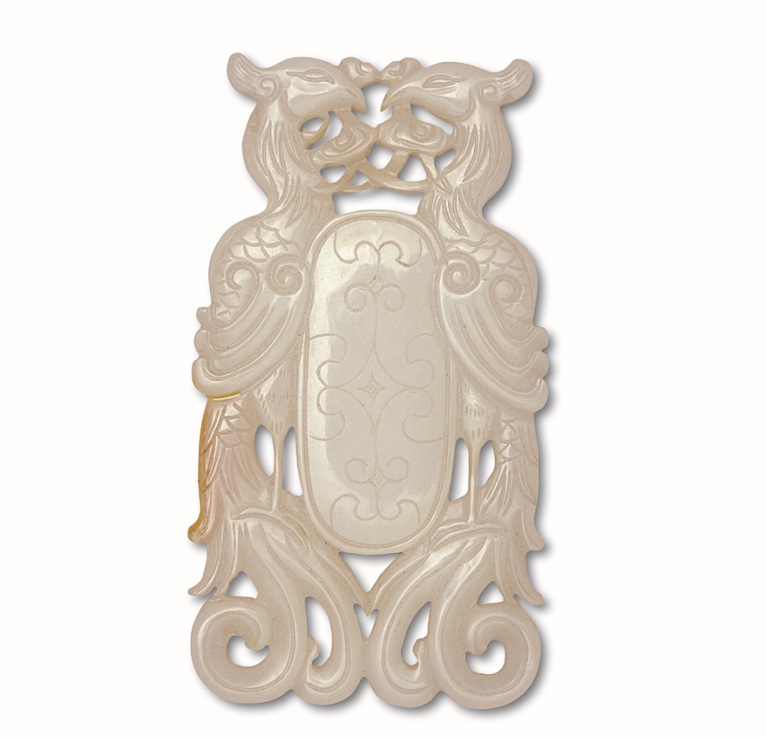 宽6.5cm,高7.8cm。玉为暗白色,局部呈褐赭色,片状,中部为心形玉片,表面饰云纹,中心有孔。玉片上部透雕云头装饰,两侧分别透雕螭、凤,螭细身,大臂,长角,长尾,凤亦细身,长尾,头顶之翎长而分叉。"