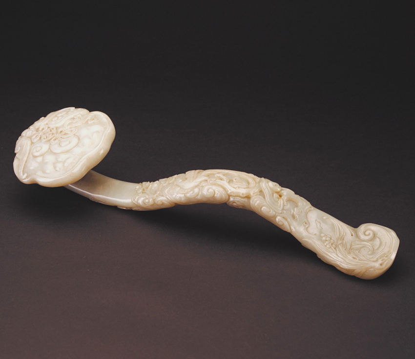 长42.7cm。如意青玉质,如意头灵芝形,上饰蝙蝠衔符节,配以灵芝纹。柄部修长弯曲,拱面上浮雕凤纹和万年青等图案。
