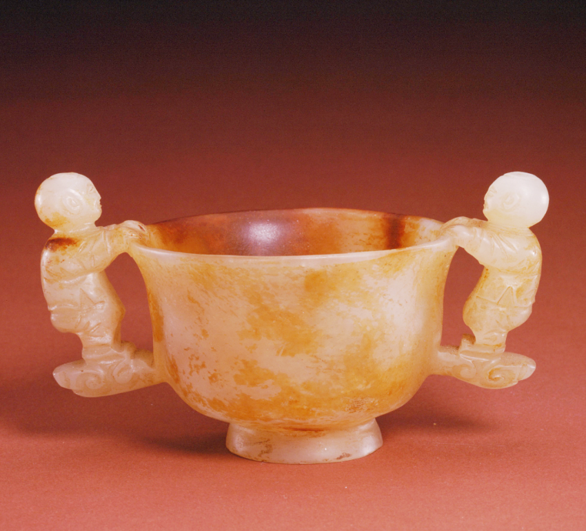 爵杯仿自商周青铜爵,所饰纹饰也多出自古彝器,但其下所具的托盘具有清代特点。清乾隆时期,在玉器、瓷器、珐琅等多种手工艺品中都可见到此种形制的仿古爵杯。"