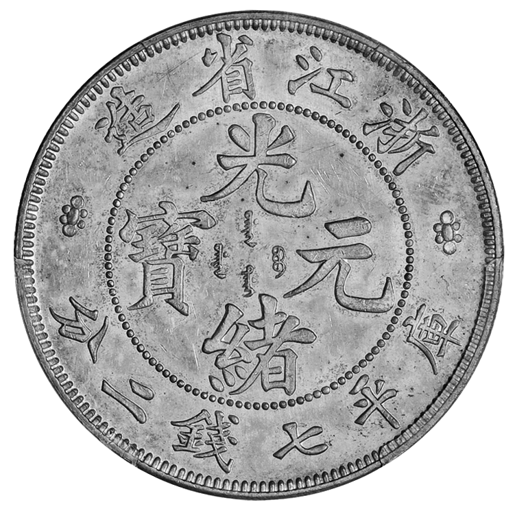 ▲浙江省造楷书体光绪元宝七钱二分银币样币