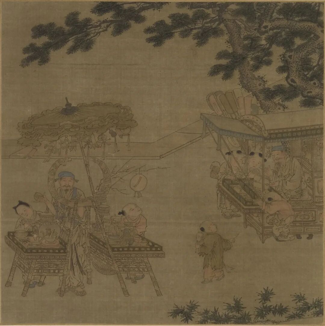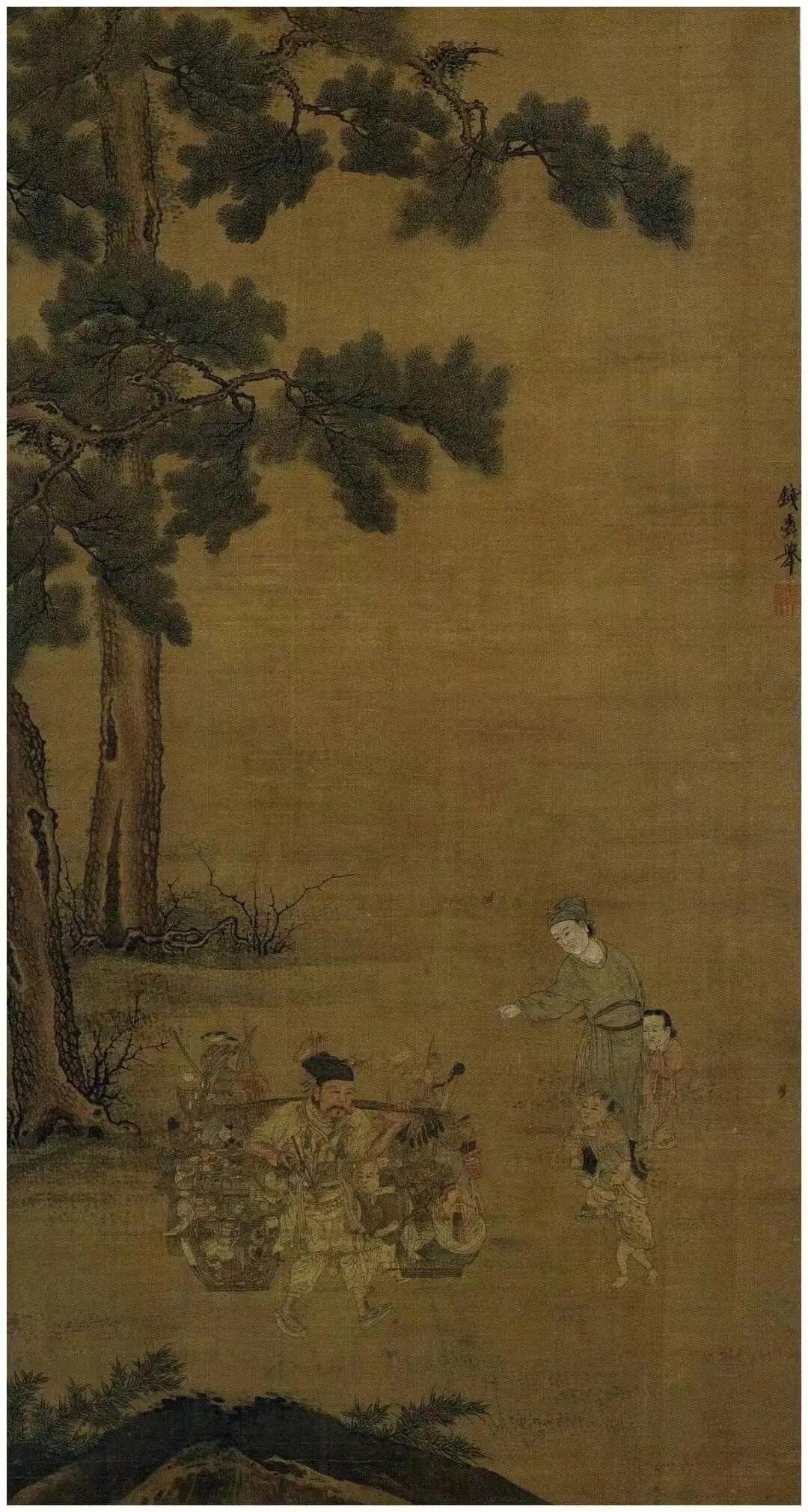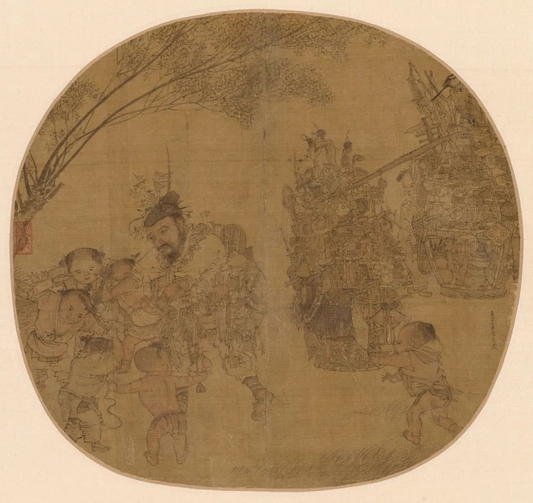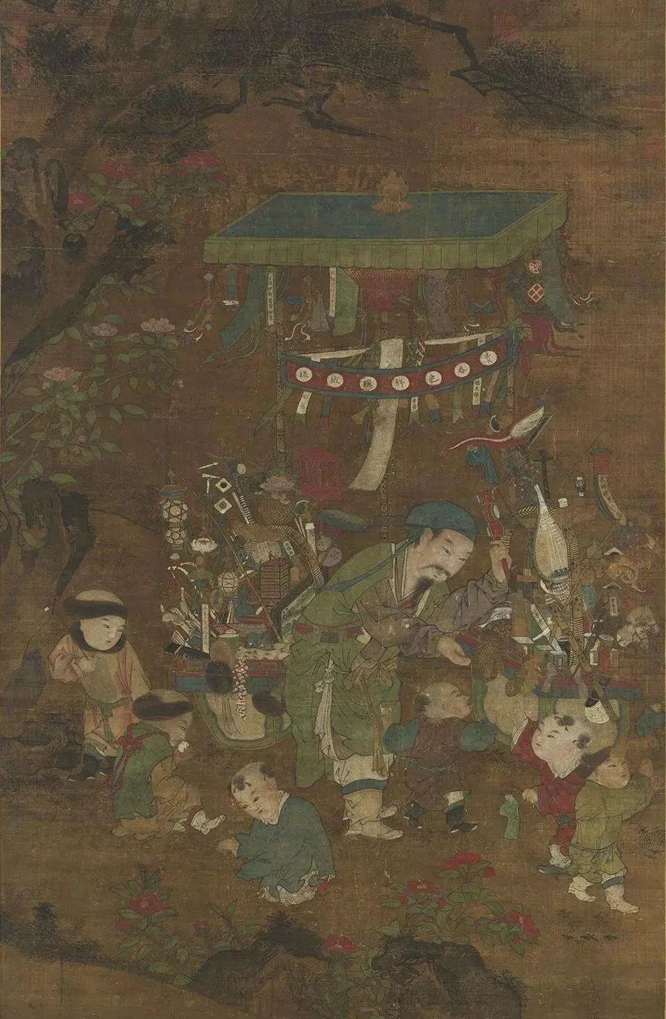 旧传李嵩作。李嵩绘有多幅货郎图,但大多为白描绘制,此幅设色,粗壮的松树下,两处货架,孩子们被琳琅满目的东西吸引,两头蹿,两位货郎和蔼可亲地向孩子们展示物品。