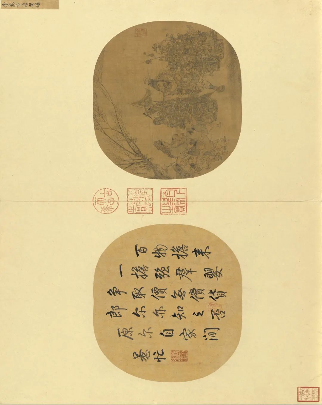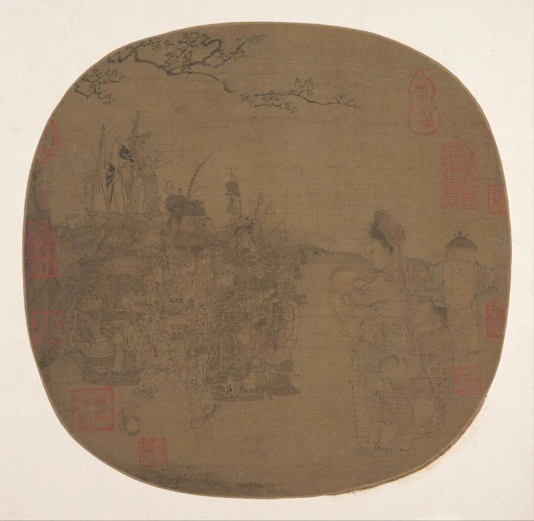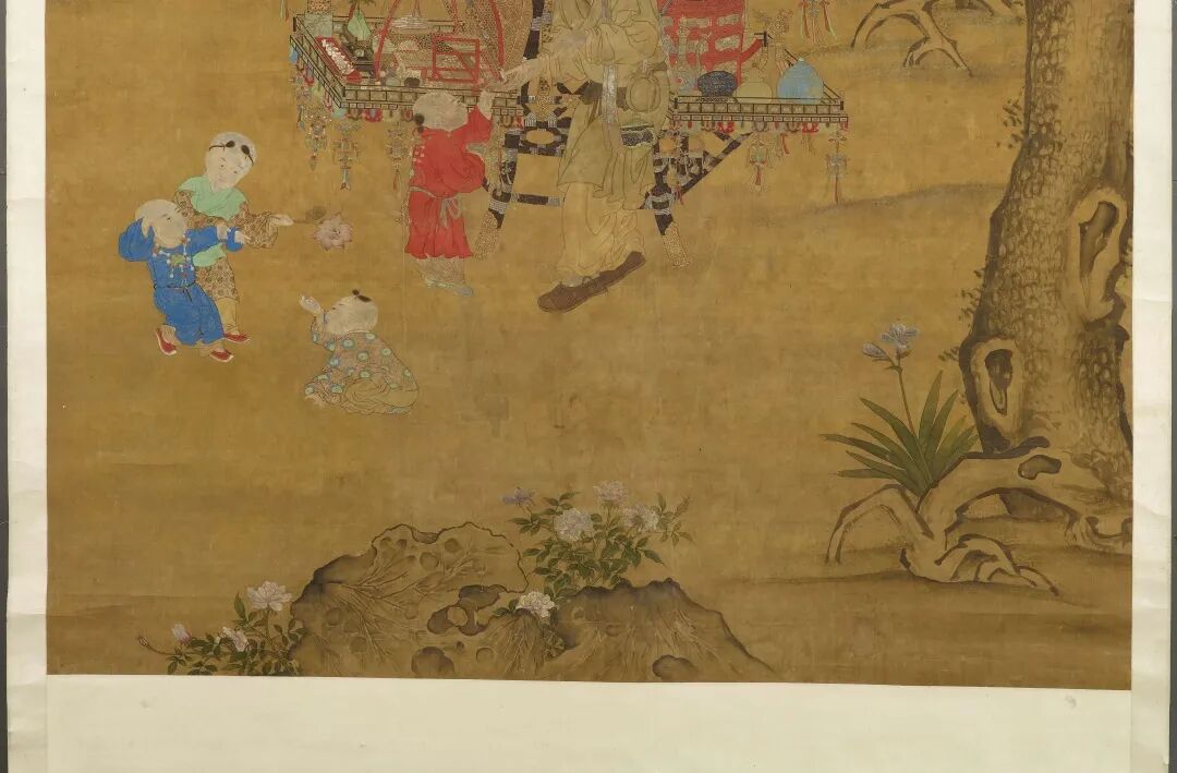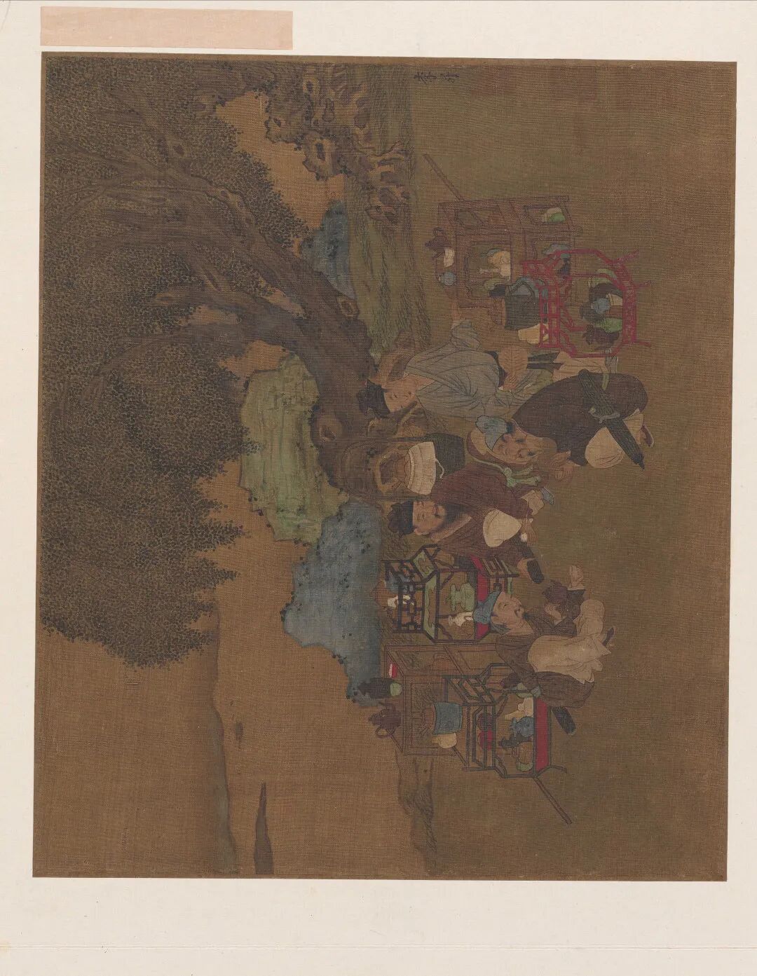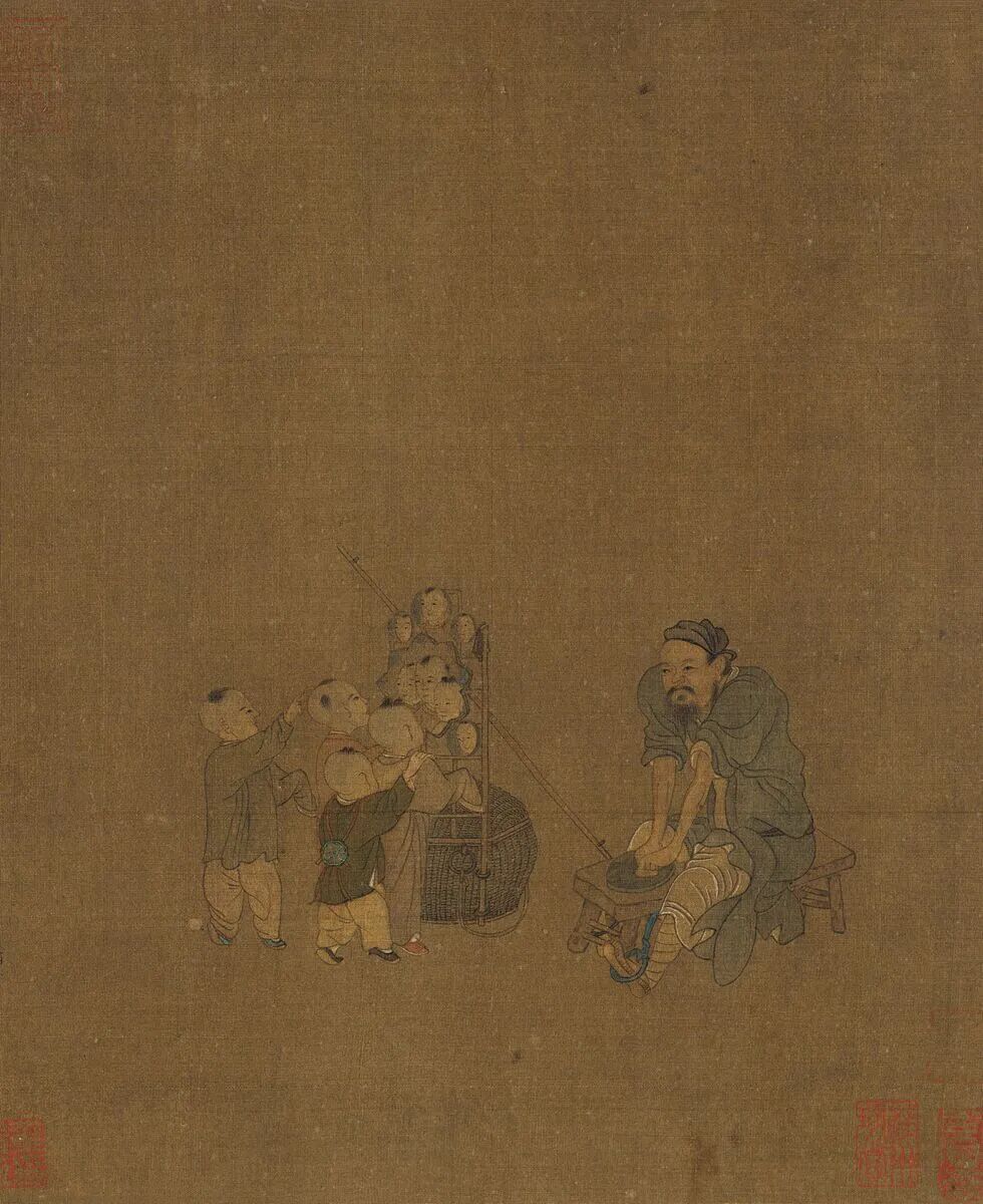 旧传李嵩作。李嵩绘有多幅货郎图,但大多为白描绘制,此幅设色,粗壮的松树下,两处货架,孩子们被琳琅满目的东西吸引,两头蹿,两位货郎和蔼可亲地向孩子们展示物品。