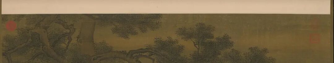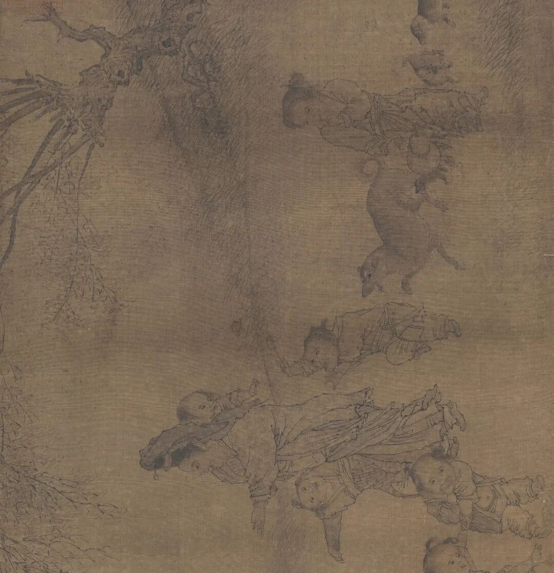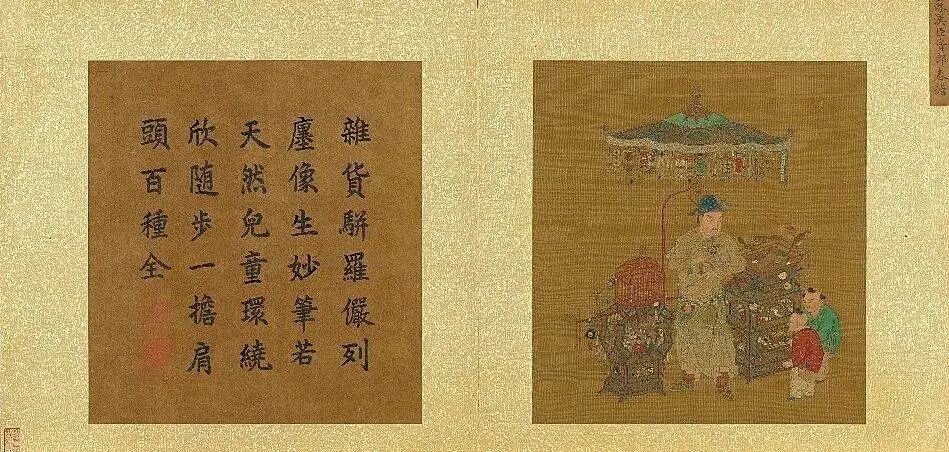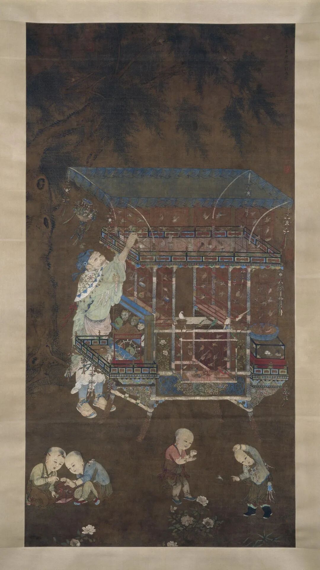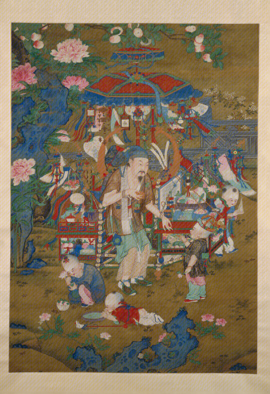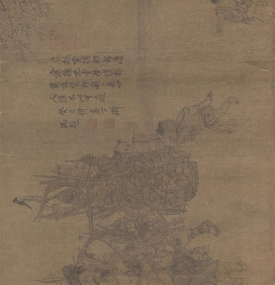 旧传李嵩作。李嵩绘有多幅货郎图,但大多为白描绘制,此幅设色,粗壮的松树下,两处货架,孩子们被琳琅满目的东西吸引,两头蹿,两位货郎和蔼可亲地向孩子们展示物品。