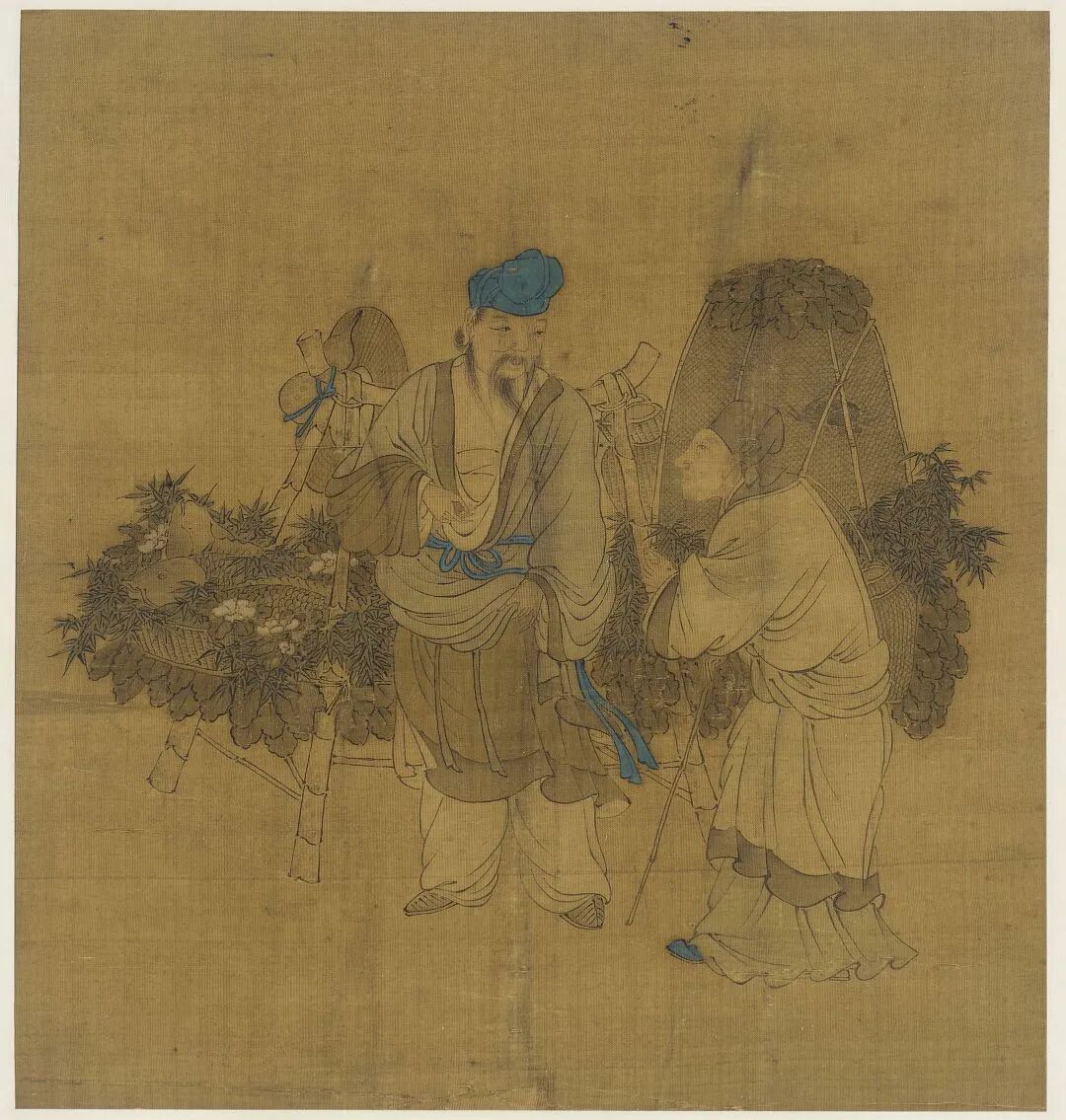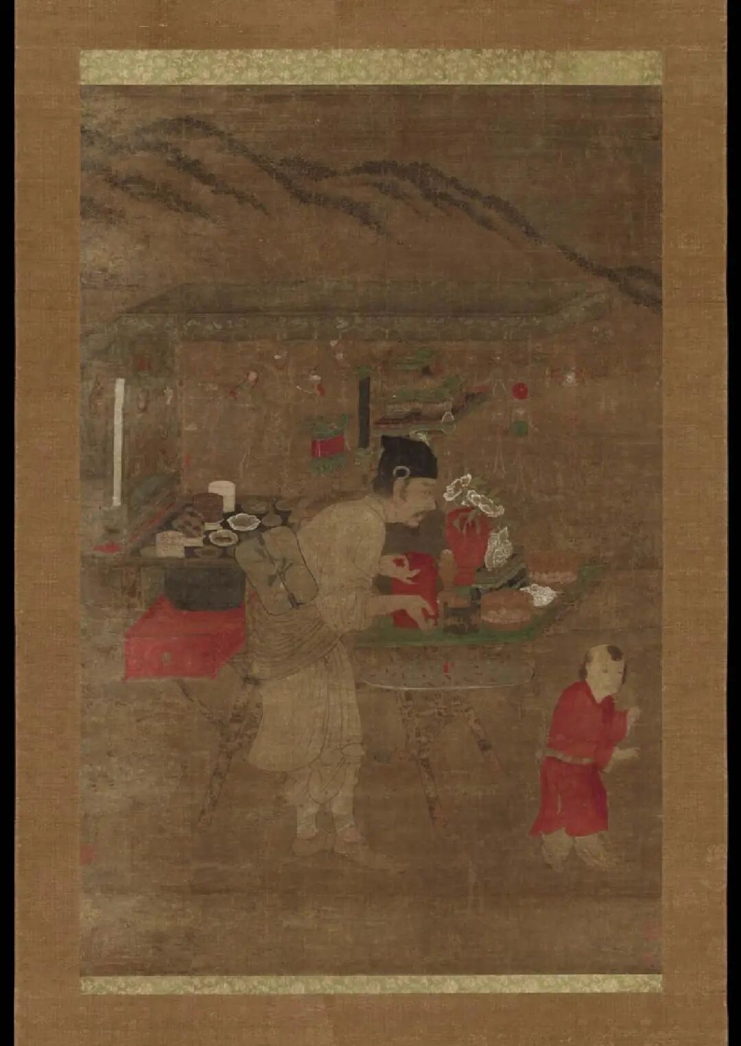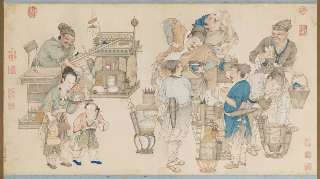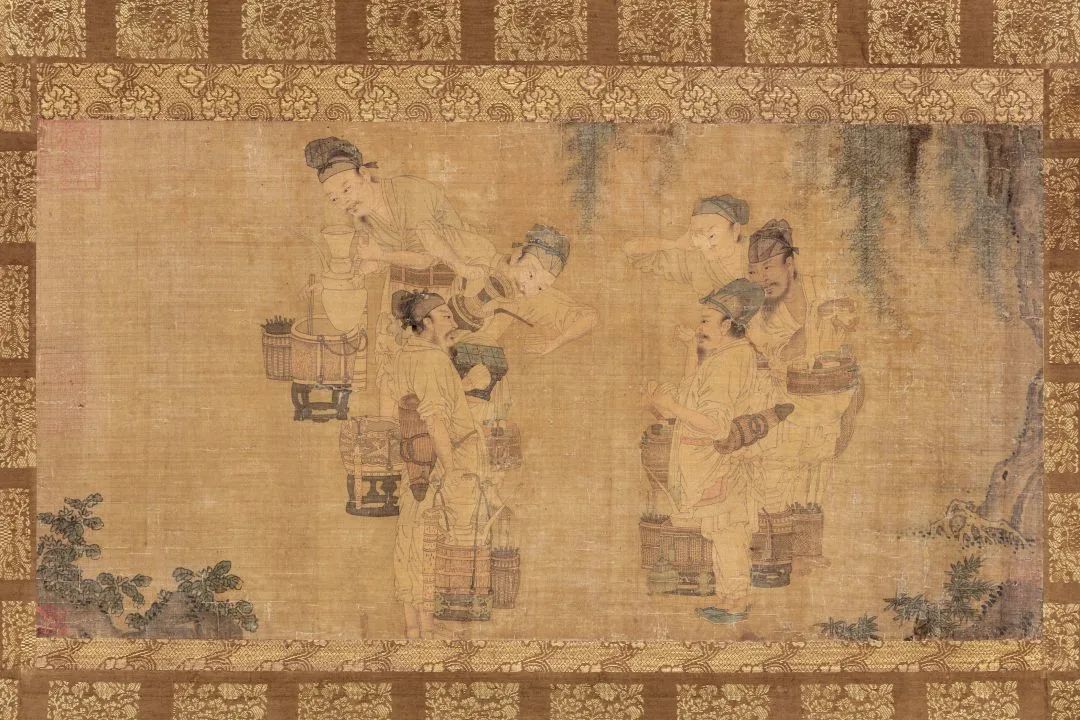 图绘民间卖浆商贩买卖的场景。人物刻画写实传神,线条劲细流畅,敷色鲜润明雅。画中还细致描写了货担中及购买者携带的器形对象,反映出当时百姓的生活面貌。