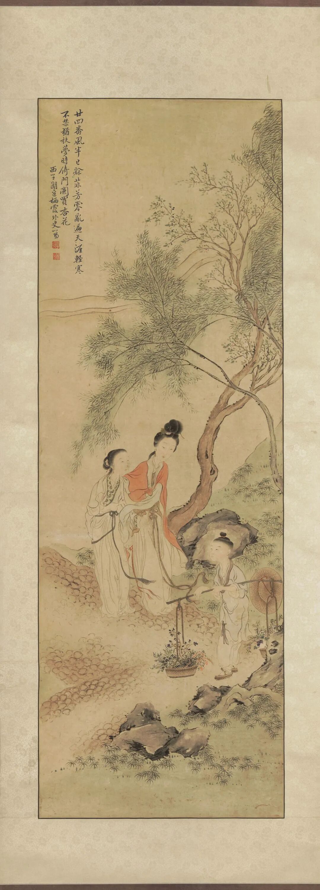 图绘杨柳杏树塘边,一小僮挑担卖花,一仕女在丫鬟搀扶下在看花欲买。人物形象柔弱娇媚,代表了清代中期仕女人物画的时代风尚。
