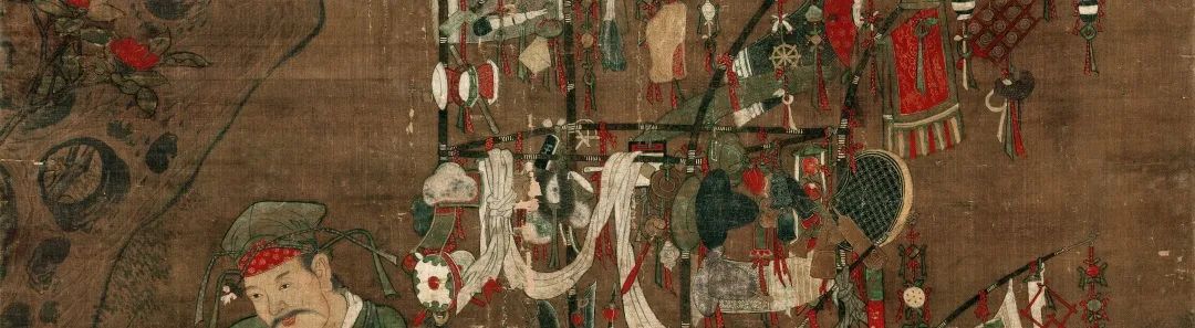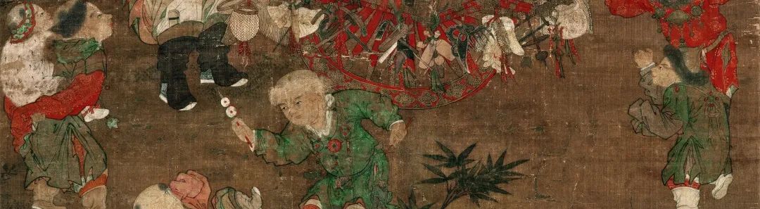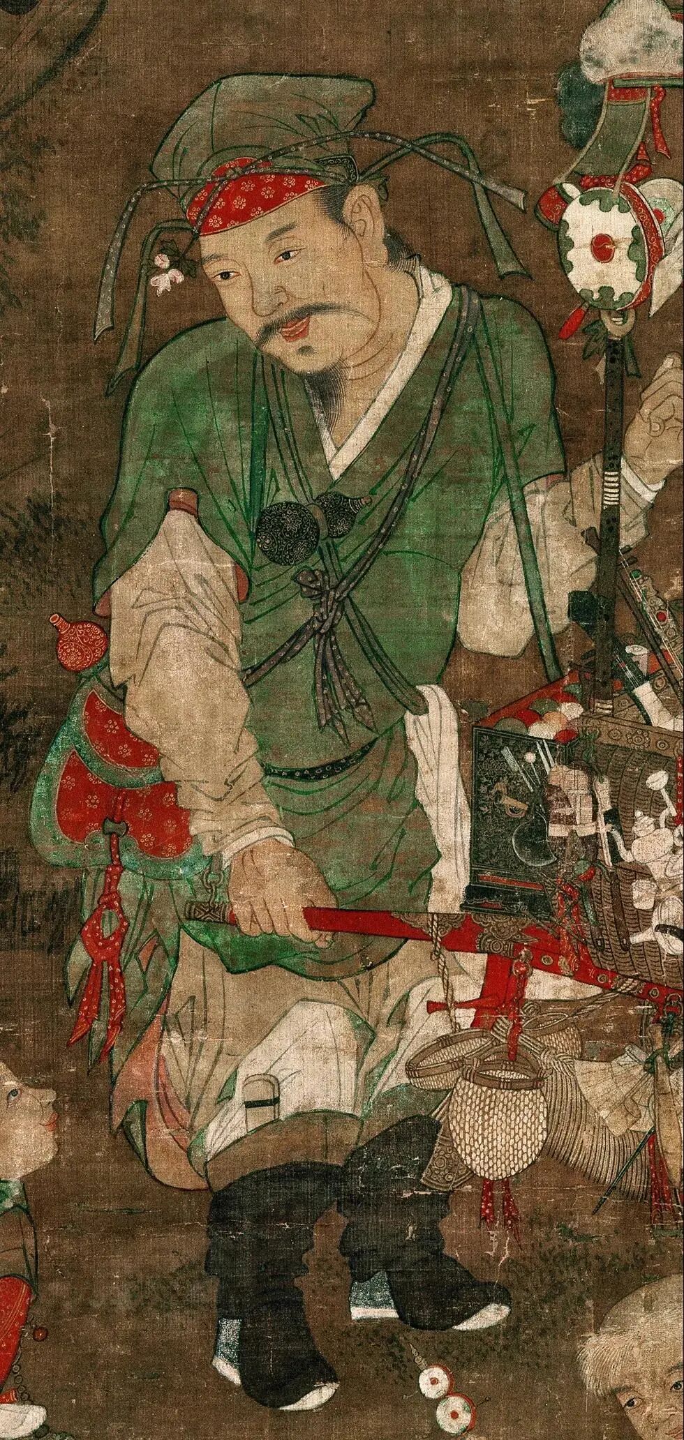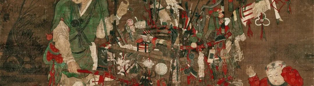 画卷中段左侧所绘两位货郎中,右侧肩搭浅青汗巾的货郎,左手前伸,正在收取面前童子手中的铜钱,右手手中似托举一物,当是售卖给童子的货物。童子身后还有另一童子正在排队等着挑选货物。再看画卷前景处,分别画了四位童子童女,手中执有花灯、木偶和瓷瓶,其中两个花灯体现的当是“年年有余”和“太平有象”的寓意。这四位童子童女显然刚从两位货郎的货摊上购买了玩具,正在玩耍。但画面左侧肩搭红色汗巾的货郎,不仅在售卖玩具,还在一手提锣作敲击状。这或许显示出,元宵庆典中的货郎不仅只是简单扮作市井中的货郎,售卖各类玩具器物,还兼具说唱表演的身份。