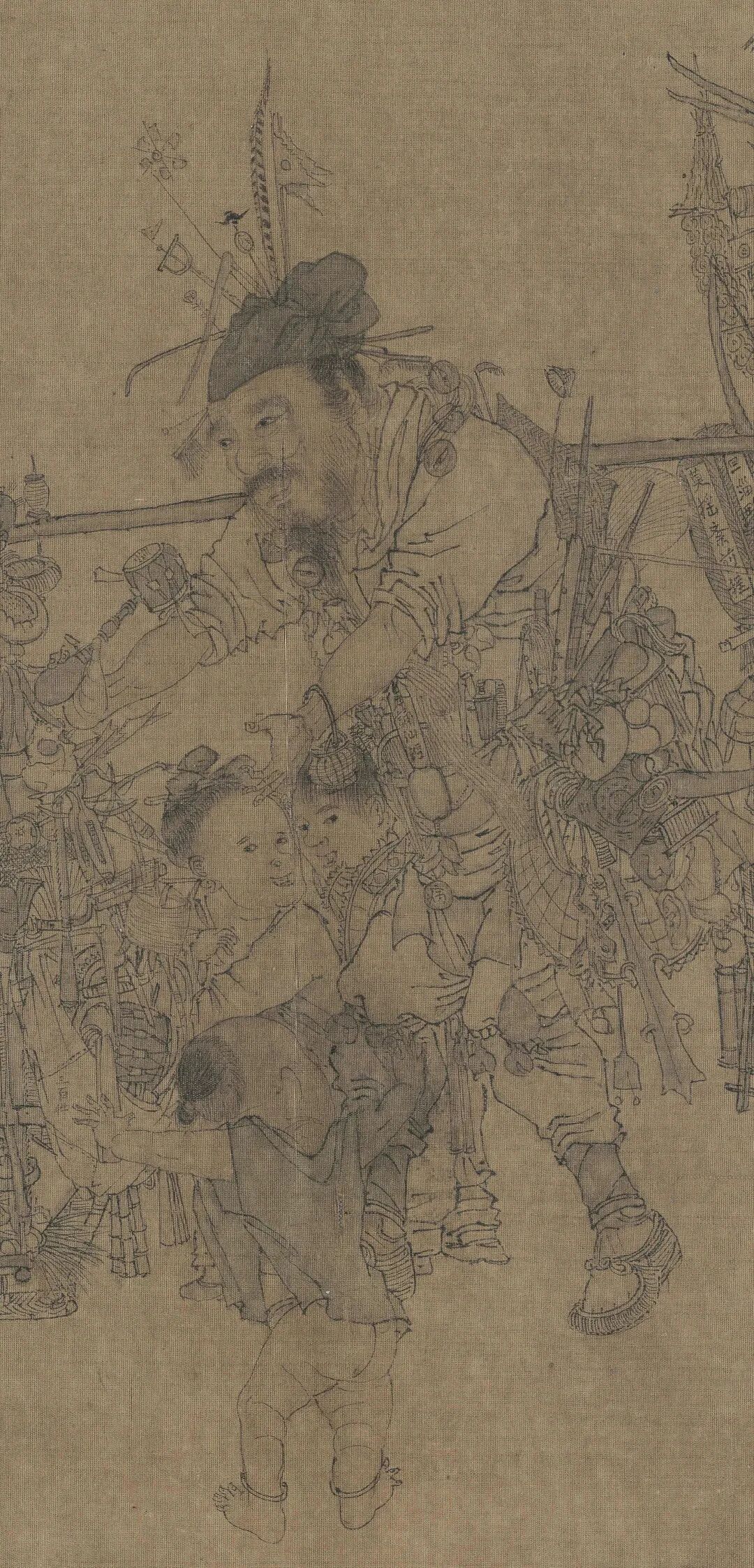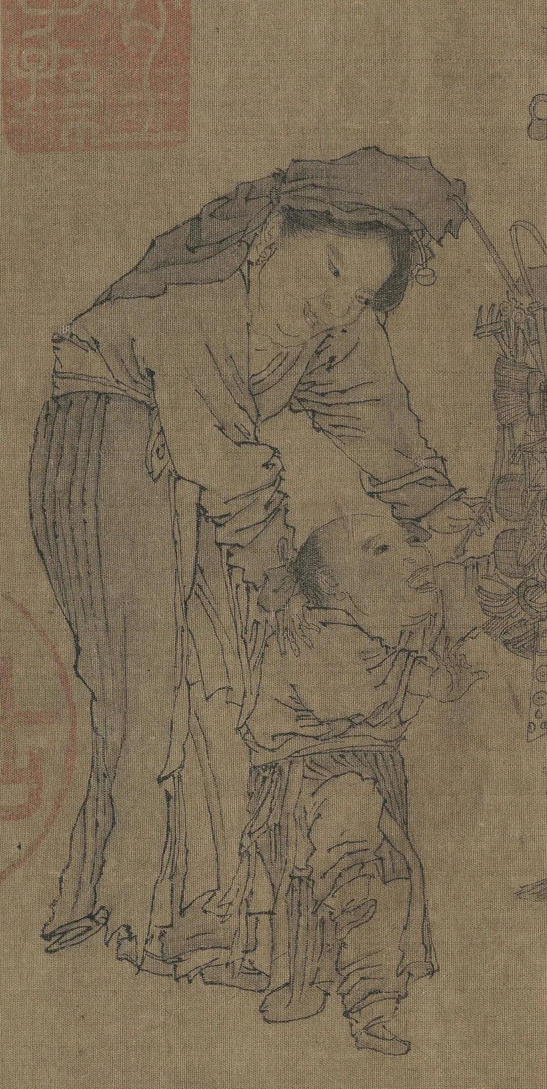 旧传李公麟作。白描绘人物、货担,与宋代画家李嵩《货郎图》风格相似,然气息未到宋。题签:宋李龙眠。但从历史上流传的画来看,李公麟喜绘白描,而并未绘过货郎图。