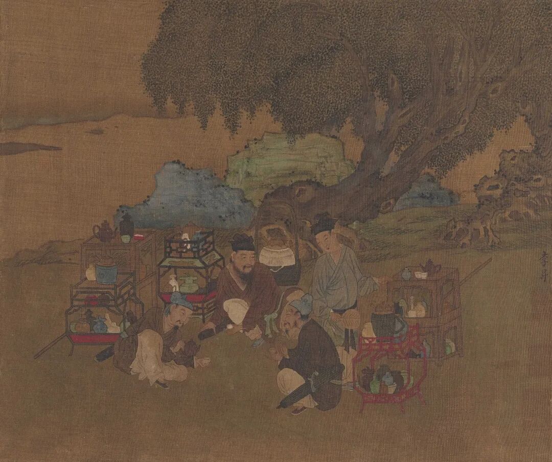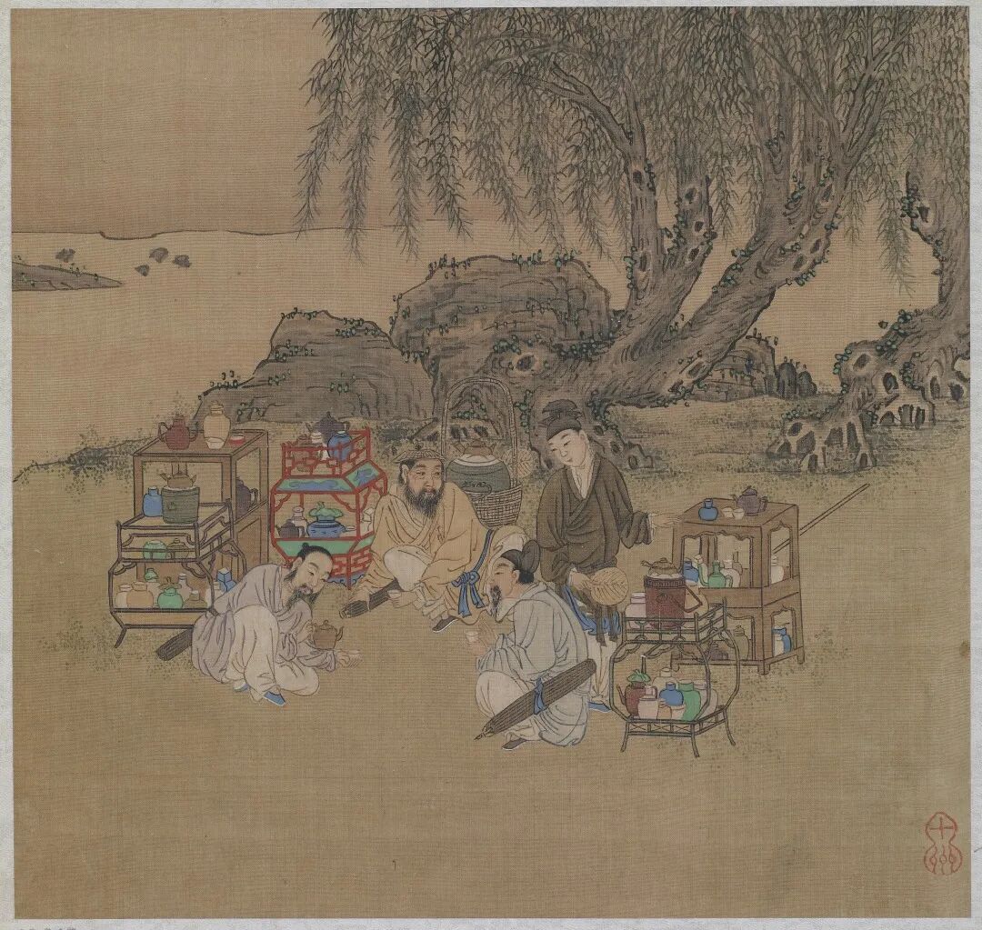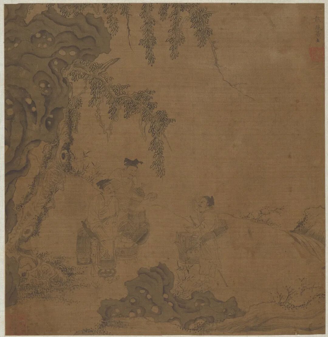 图绘四个货商打扮的人在一处临河树荫下纳凉喝茶的情景。画中共五个货架,架中摆放着瓷器与茶具。画中着褐色衣服的三人一边喝茶一边聊天,似乎在谈论茶汤的味道与色泽;另有一人右手握蒲扇,左手扶货架,正一边烧水一边转头倾听他们的对话。此画右侧偏中下处有“李昇”字样的落款,还有三方模糊不清的印章。