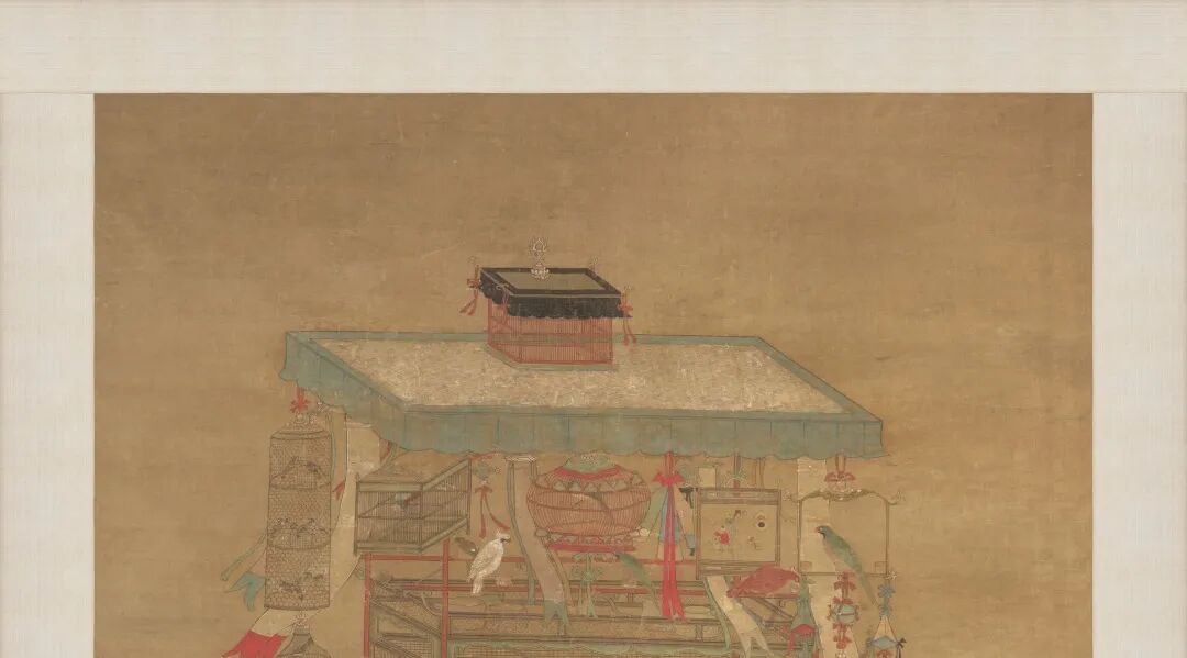 货郎图自宋代以降,常被画家引为表现主题。本幅无名款,画春日郊园中,桃花初绽,新柳泛绿,杂草野卉丛生于小溪石畔。柳荫下停放一货担,架上满置鸟笼,笼中鸟色品种殊异,四周并缀有各式童玩。货郎二人,一人手执鹦鹉兜售,另一妇人携二童立于担前,举手雀跃作欲索取状。人物设色妍雅,服饰细节考究,神情活泼生动,表现出古代社会恬静闲适的生活情态。