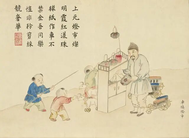 元宵灯节是过年的压轴好戏,提灯赏灯,车水马龙。画中卖花灯的小贩卖各式花灯,小娃娃围着挑选,仔细选出一只可以炫耀的花灯。