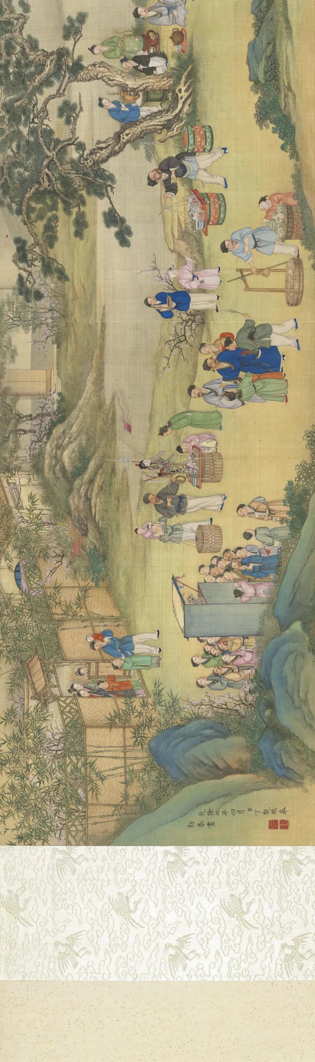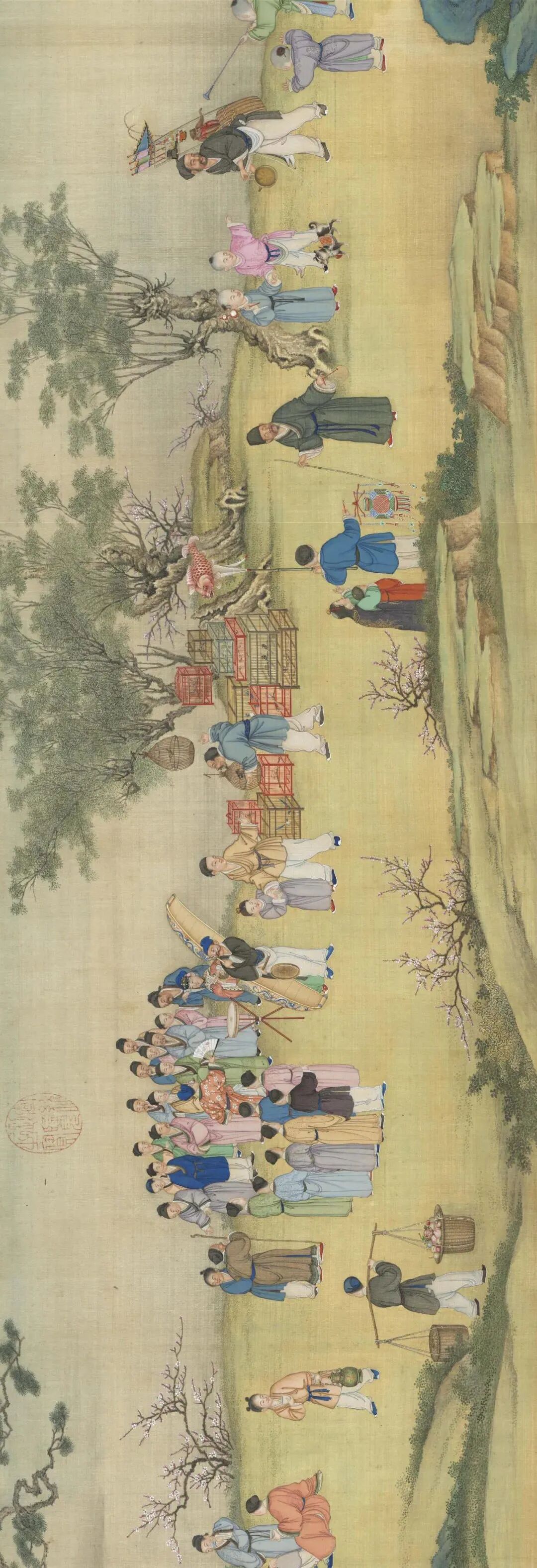 此幅画成于乾隆七年(1742年),图绘太平盛世,新春市集上各项摆摊以及欢庆春节情景。画中乡人互相打躬作揖,摊贩卖爆竹,打太平鼓、耍猴戏、跑旱船,戏棚,货郎担,游人市贩,松树桃竹,皆生动逼真。卷中有松下的品茶聚会,松后三僮备水烹茶;树下三文士品茗闲谈,手中各执青花茶碗,右边地上朱漆托盘内,置一组紫砂茶壶与青花茶碗。从六人身分看来应属主仆关系,而不是茶摊卖茶,三人或是偕伴野外品茶。