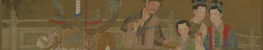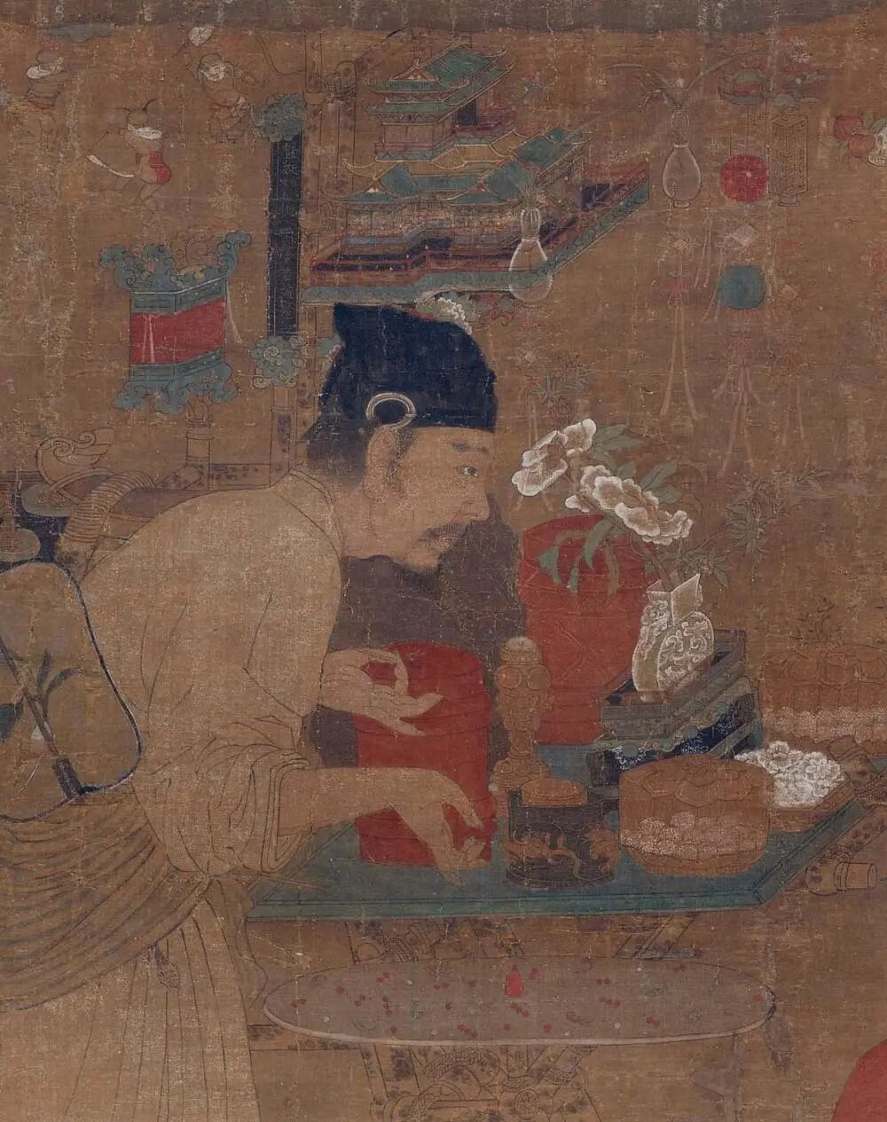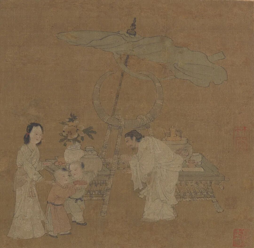 图绘皇宫大内后花园雕栏玉砌,一位乔装的冷饮博士在给一位小沙弥倒冰水饮料。从茶壶的龙纹雕饰上可以看出这不是一个普通人家,或是明代御用画家画皇帝的御容来配以一定的场景,像今时的“角色扮演”,皇帝、后妃、公主、小皇子都是演员。