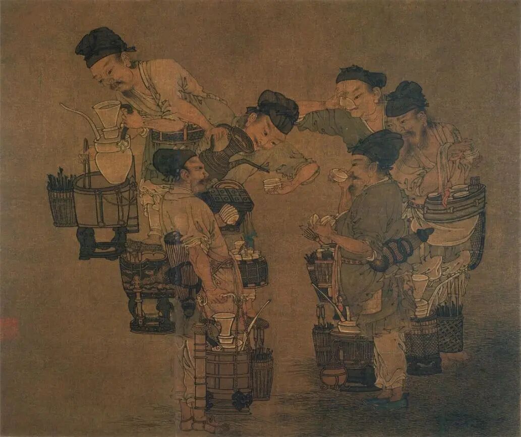 “斗浆” 即“斗茶”,又称“茗战”或“点茶”,指以竞赛方式比较茶叶质量和品茶技艺高低的一种活动。斗茶最早出现在唐代,曹邺(约816-约875)《梅妃传》载:“上(玄宗)与妃斗茶,顾诸王戏曰:'此梅精也,次白玉笛作惊鸿舞,一座光辉,斗茶今又胜我矣。'”至宋时,斗茶活动十分兴盛,无论平民百姓、茶民茶商,还是文人雅士、皇亲国戚,几乎各个阶层都喜好斗茶。宋代人斗茶时间多选在清明节前后,而斗茶地点却无限制,参与者会以对决的方式来品评茶叶质量,有着比技巧、斗输赢的特点,具有一定的挑战性和趣味性。北宋范仲淹有《和章岷从事斗茶歌》一诗,形象地描绘了斗茶时的热闹场景:“鼎磨云外首山铜,瓶携江上中泠水。黄金碾畔緑尘飞,紫玉瓯心雪涛起。斗余味兮轻醍醐,斗余香兮薄兰芷。其间品第胡能欺,十目视而十手指。”作为南宋风俗画的代表作之一,《斗浆图》中所描绘的十分热闹的街头巷尾斗茶情景,在生动展现着宋代斗茶风气之盛的同时,也充分反映了宋代独具特色的斗茶文化和市井生活。