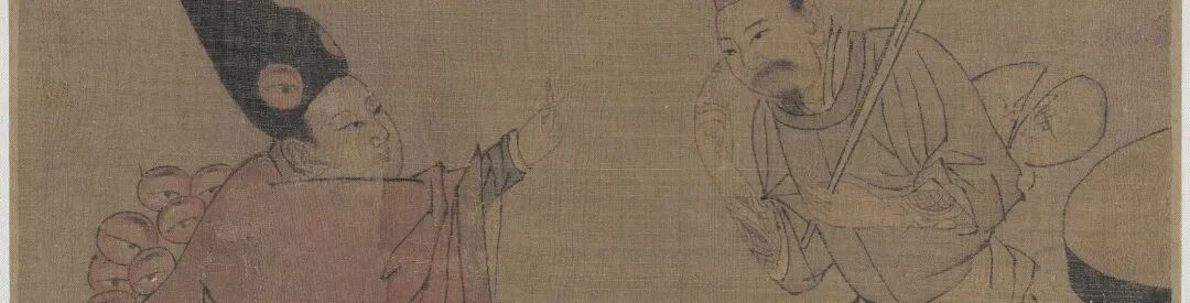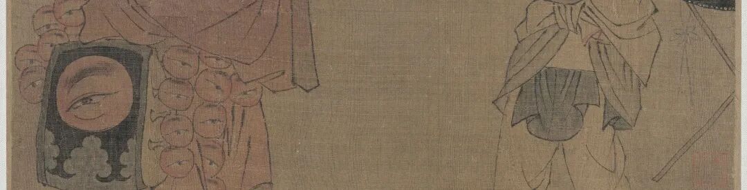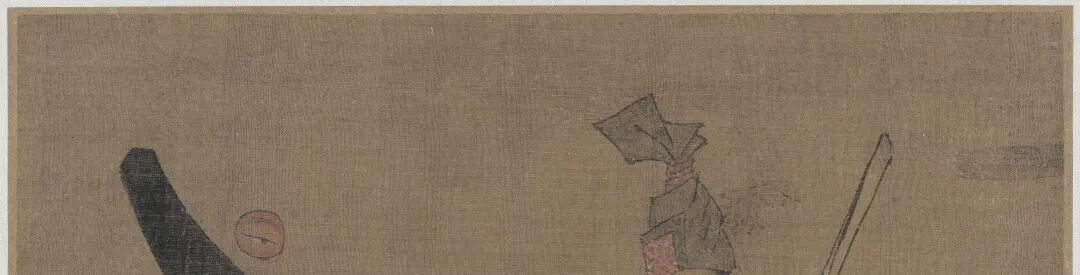 图中一人腰插一扇,中间开裂,上书一字似“诨”,可能是插科打诨、故意装傻的意思。此人臂肘间有“点青”,右手指眼睛,左手握一板。另一人衣冠绘满眼睛图案,一手捏着眼膏瓶,显然是在推销眼药。画幅右侧有一大鼓,仅见小半。此图虽然绘制的是戏剧场景,但人物的动作、神态表现得非常到位,体现了画家对当时市井生活的关注。另外,人物的服饰、装扮对于研究宋代文化具有一定的参考价值。