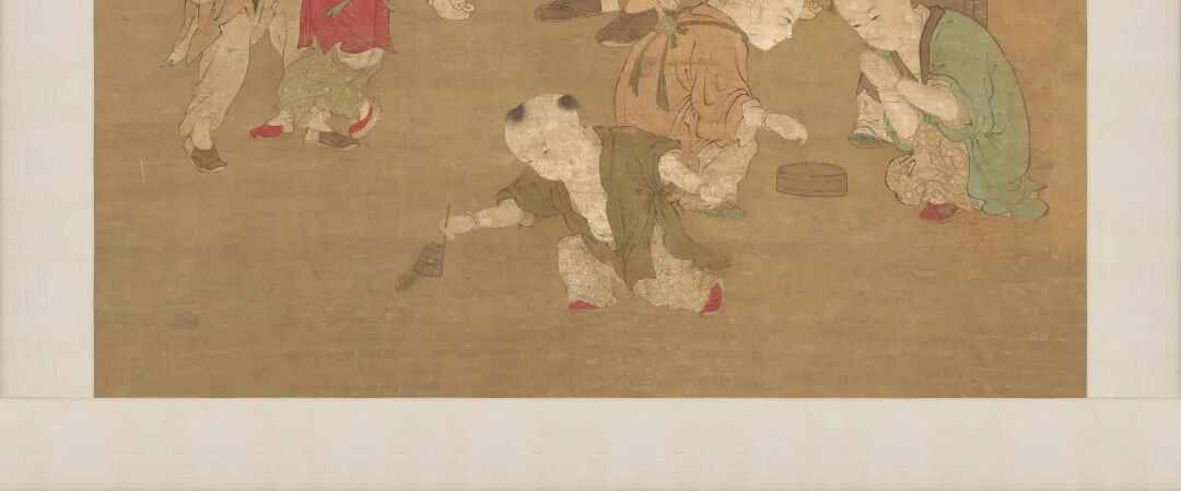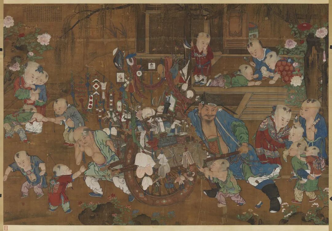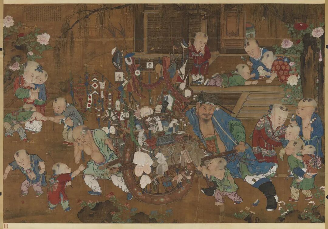 图绘货郎和他的助手,推着满载物品的独轮车,来到庭院里。四周,孩童们迫不及待地冲向担前,有拿铜钱的、掉鞋子的,还有两人抢夺玩具,互不相让。吵闹声响彻云霄,将货郎来时的雀跃心情,描写得维妙维肖。货担上玩具、兵器、乐器、螺钿漆盒、日用杂货、香袋挂饰等,一应俱全。孩童穿着华丽,还佩戴着各式长命锁和玉佩,极为精细巧妙。