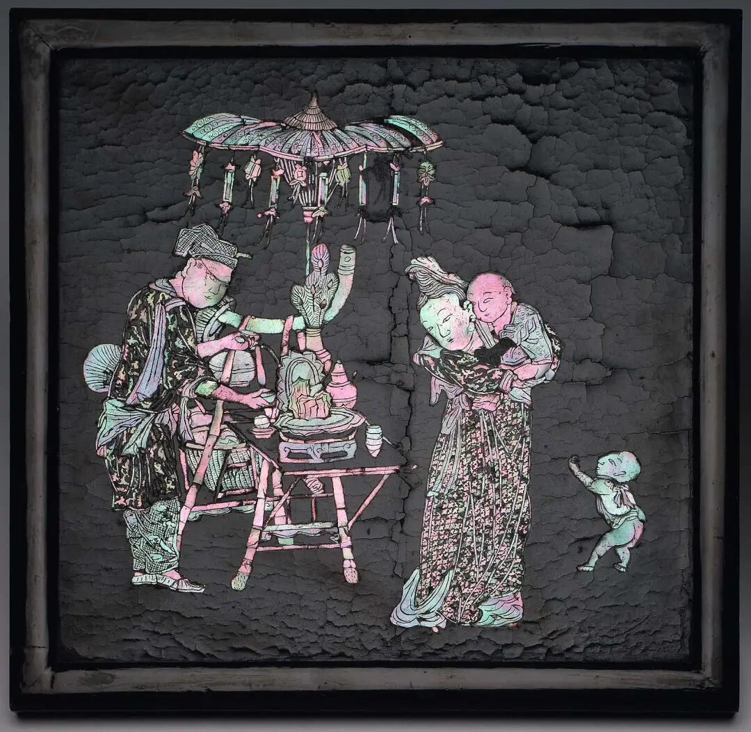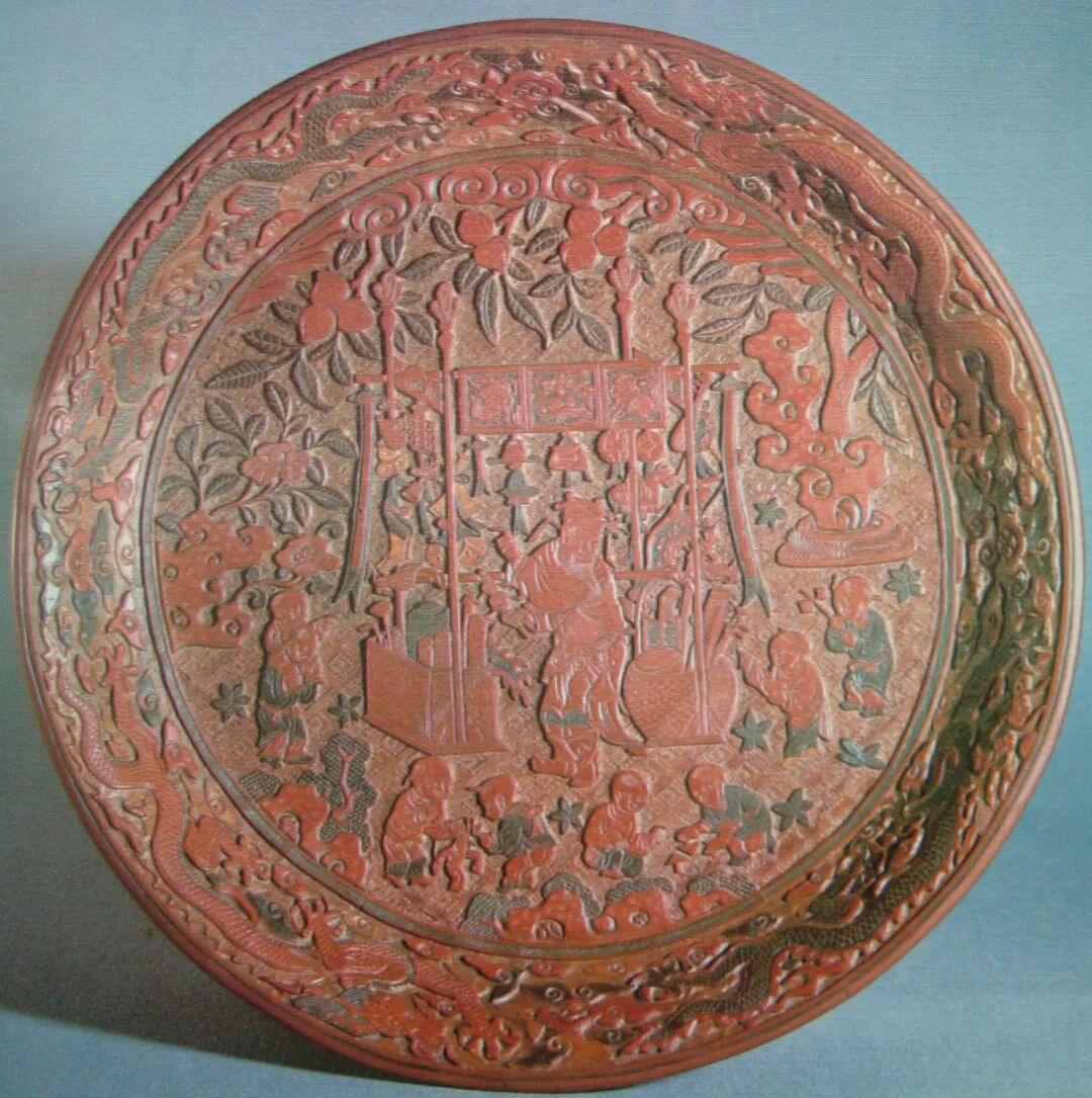 此盘漆质干涩灰暗,但漆色运用精美独到。这一时期的漆色虽仍以红、黄、绿为主,但已有同一颜色的色差之别。孩童着装与花叶红绿相间,由红绿渐黄,随妆露色,浓淡适宜。绘画题材被运用到雕漆作品中,使剔彩漆器表现出崭新的面貌。此盘画面应为师南宋画家苏汉臣的“货郎图”之作。