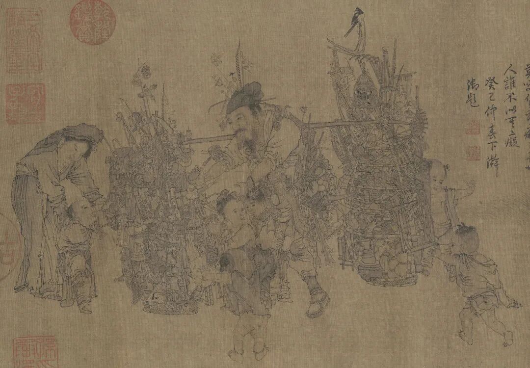 图绘货郎挑着担子走街串巷吆喝,担上物品五花八门,应有尽有,一妇人从右侧携带四娃入画,抱一个,牵一个,拽衣服的一个,最大的孩子袒胸着短裤,似乎迫不及待去货担那挑选自己的玩具。