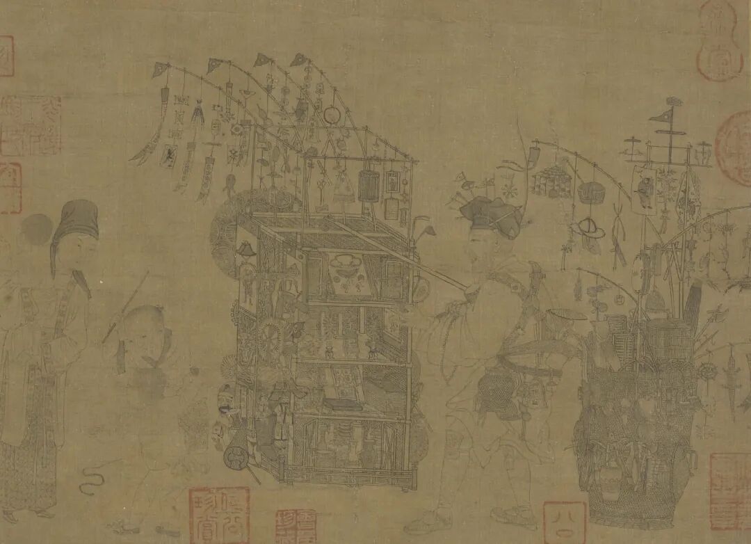 在商品流通尚不够发达的南宋时期,货郎们走街串巷,一副货担就是一个小小的百货店,货郎们不仅为偏僻的乡村带来所需的货物,也带来各种新奇的见闻,货郎的到来往往像节日般热闹,李嵩在图中就描绘了这样一幅场景。画家借助货郎这一题材表现了南宋市井生活的一个侧面,那些令人眼花缭乱的物品,虽然今天有很多已不明其用途,但却真实地记录了南宋百姓的生活方式,是民俗学家不可多得的珍贵史料。