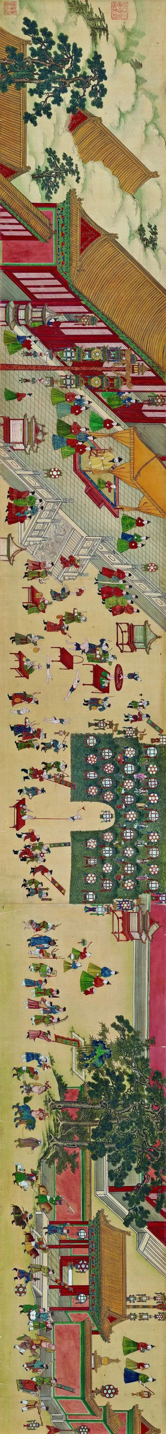 此画卷描绘明宪宗在皇宫里庆赏元宵游玩的各种情景。画面中,从早到晚的各种节目均有明宪宗在场,他穿着不同的盛装,或站或坐,表情安详,在欣赏着元宵节的各种活动。