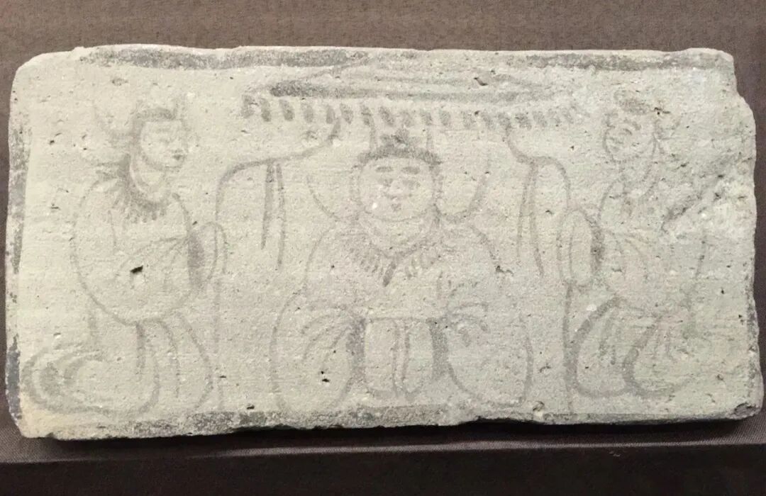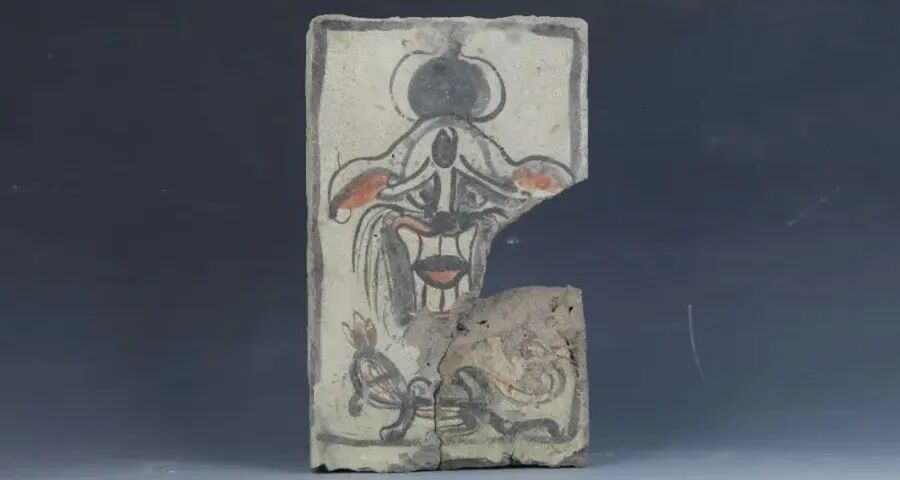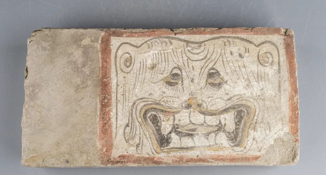 画面白底黑框,中央彩绘一头顶束髻、大耳下垂、三角眼、张嘴露齿的面部形象,其下有一只头部不清的四足兽。砖中部有缺损。有学者认为这是中国古代驱鬼仪式“傩仪”中的神灵方相式。在仪式中由人戴着面具扮演,其形象一般为熊。