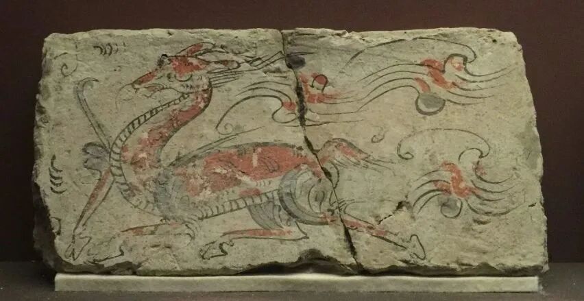 画像砖整体呈方形,为泥质夹砂,浅灰色,砖正面绘以龙形图案。所绘龙以白垩涂底,实线勾勒轮廓,深浅不一的土黄色、褐色点缀龙身,虚实相衬,颜色较鲜艳,全身布满众多交叉细黑线以表现龙鳞;龙首向左,角呈柳叶形,状似羊角,根部有须;其鹅颈凸胸,双目前视,张口吟啸,龙须下垂;前肢蹬腾,后肢作行进状,前足上部,即肩至前背处有排羽状翼,向上延出,有凌空翱翔之感;龙尾上扬,弯向其头;仿佛一条青龙活跃于砖上,反映出古人精湛的绘画技巧以及崇高的艺术境界。同时,带翼之龙为古人理想中的死后升仙工具,将其绘于墓葬之中,当是墓主人灵魂升仙的坐骑。