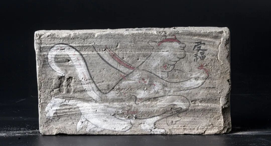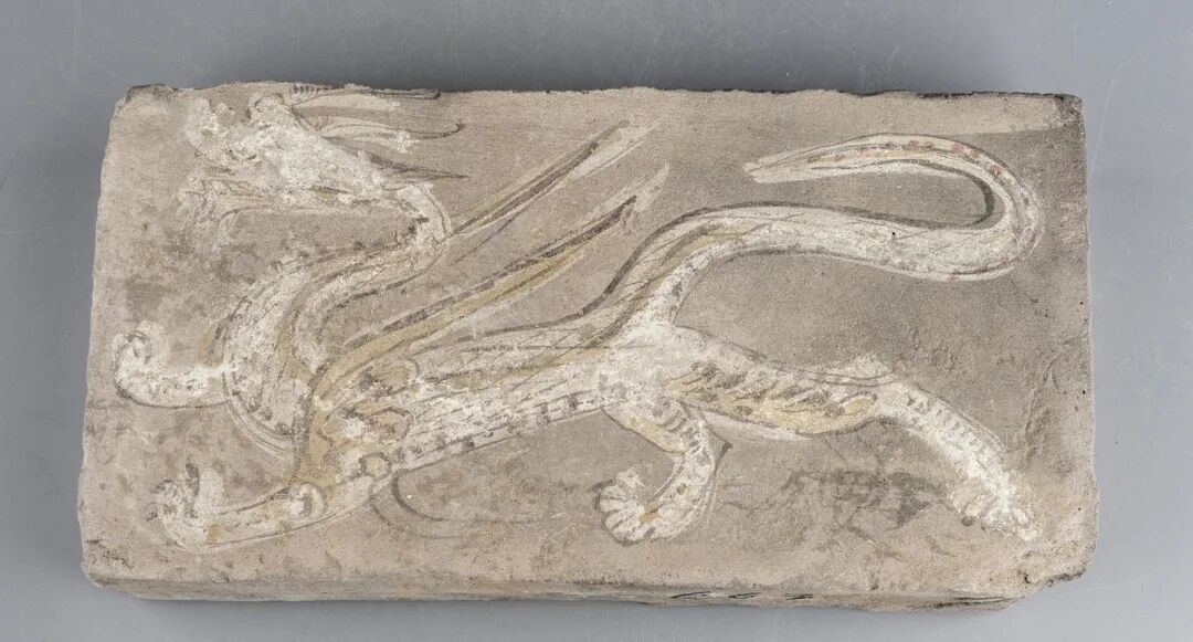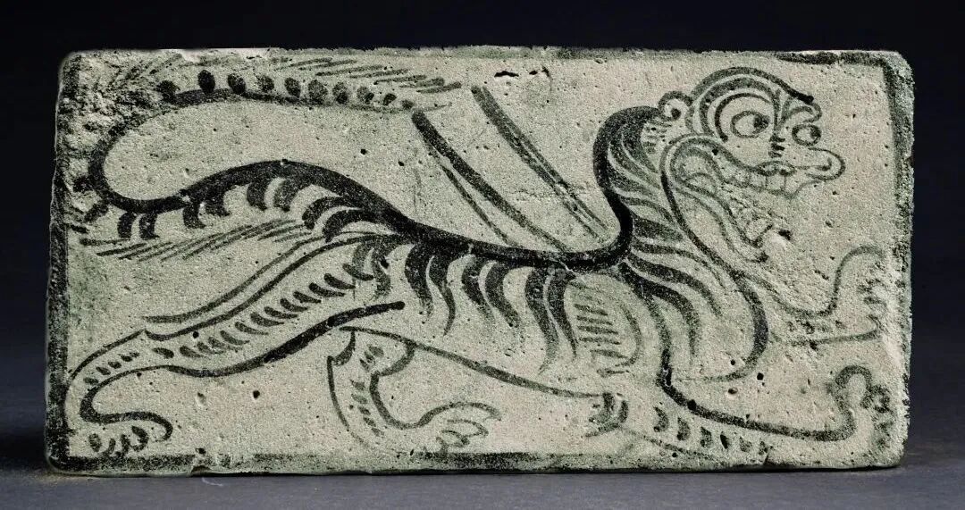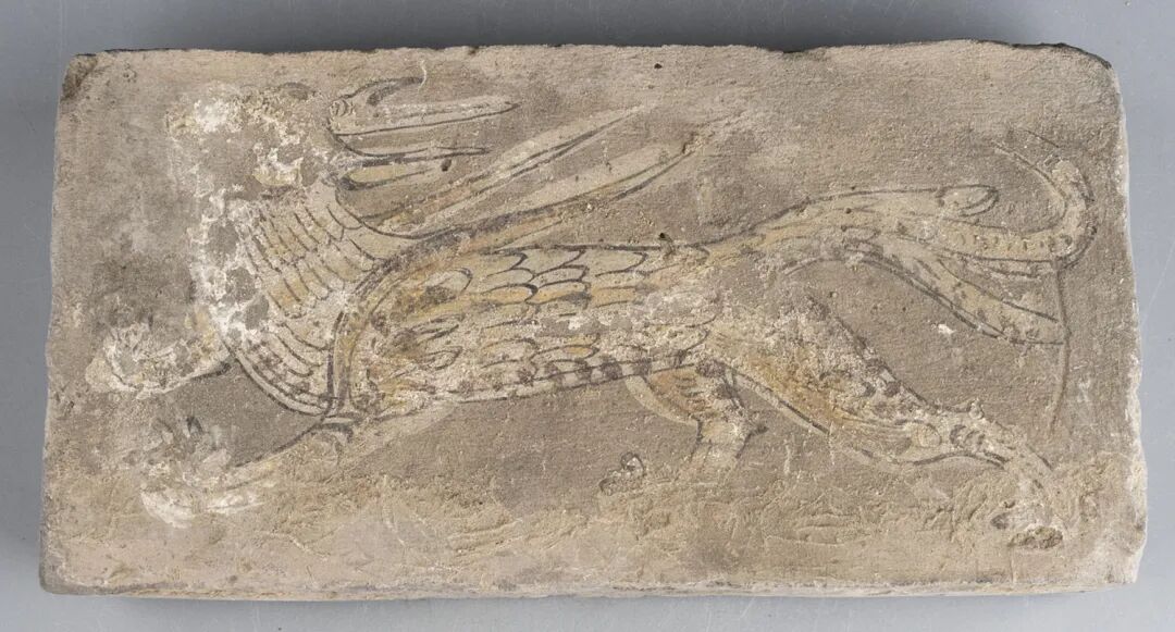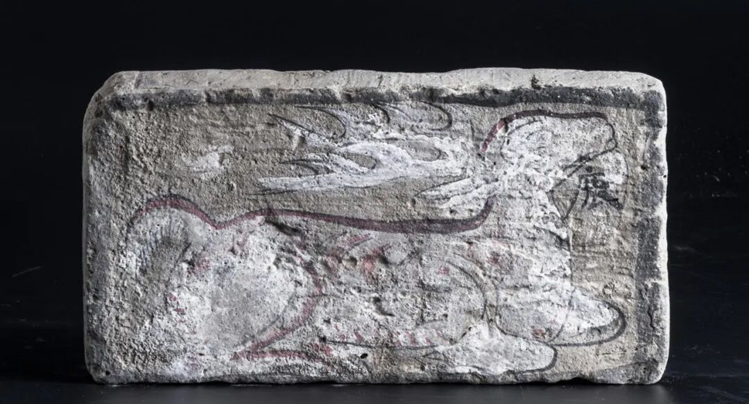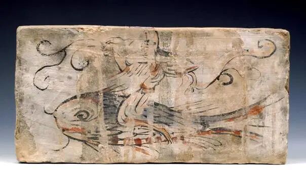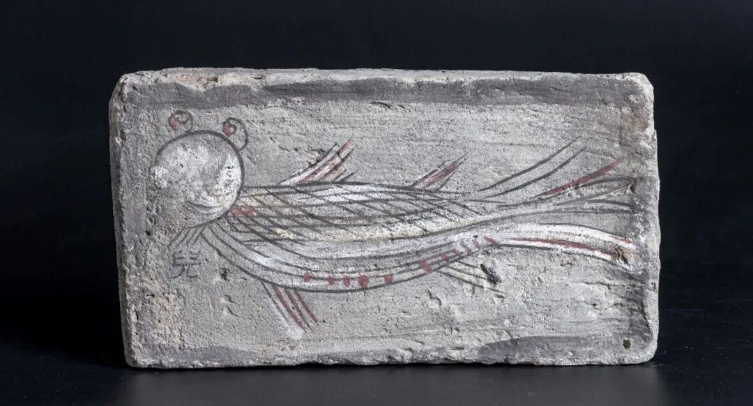 砖有墨线边框,中间彩绘一双翅高展的飞鱼,有鸟爪状的足。画面右上角有“万鳣”两字题记。