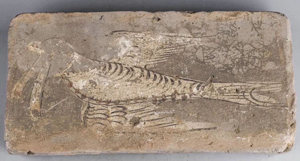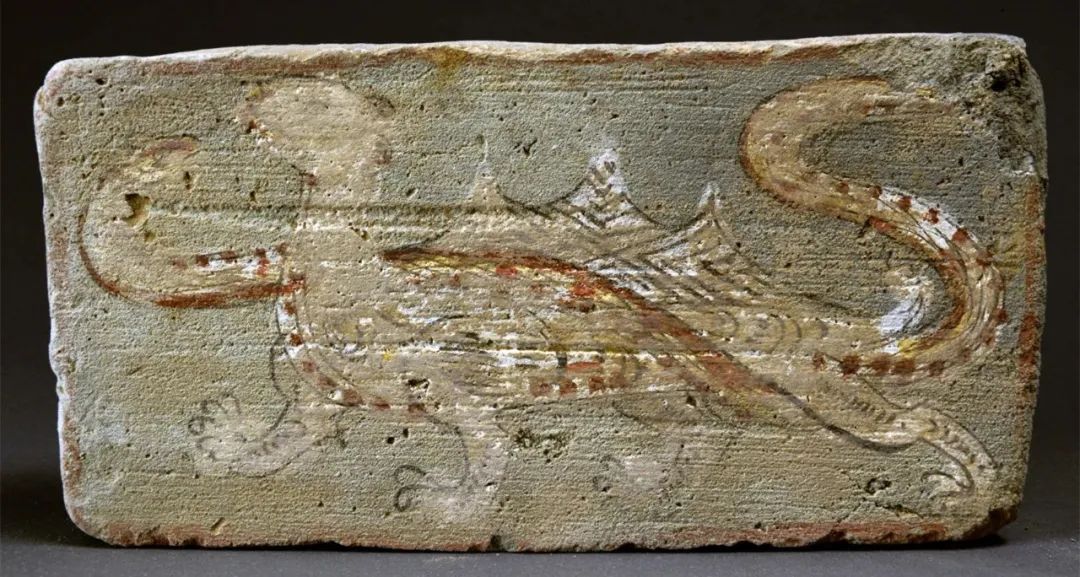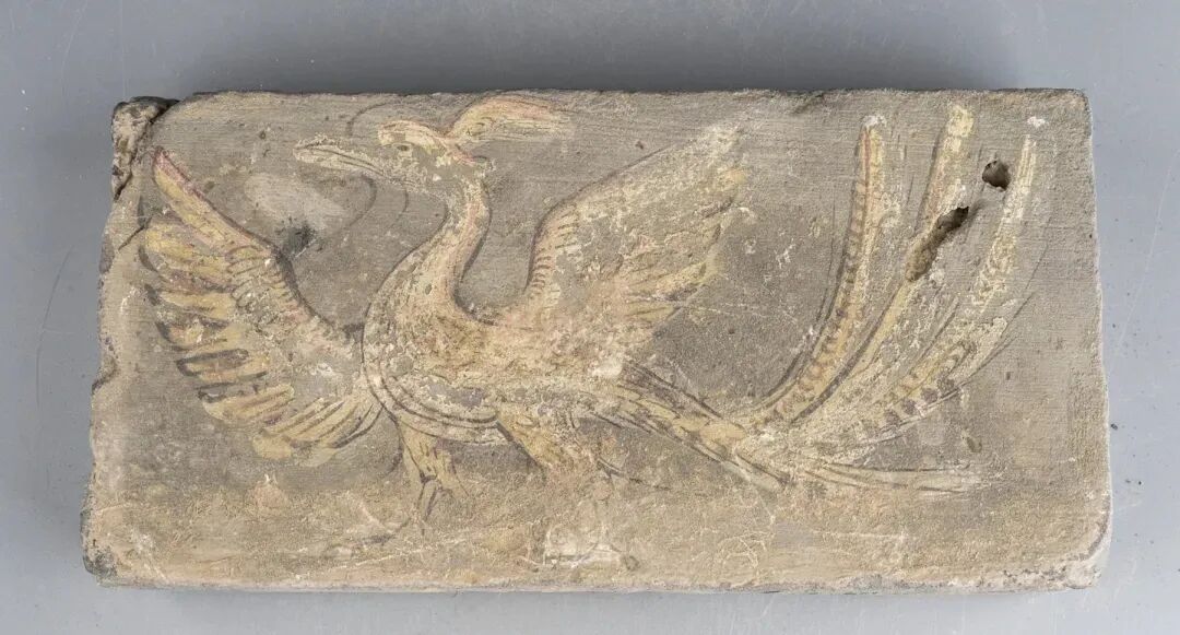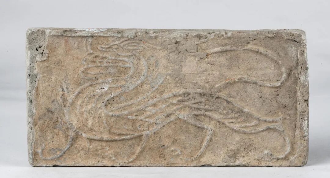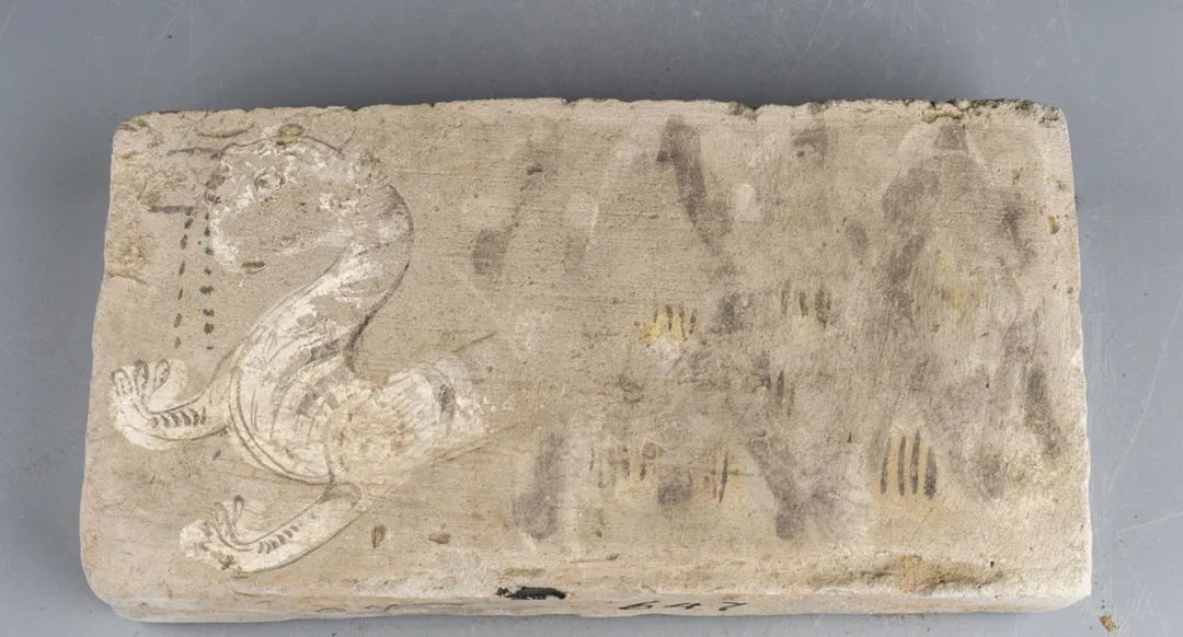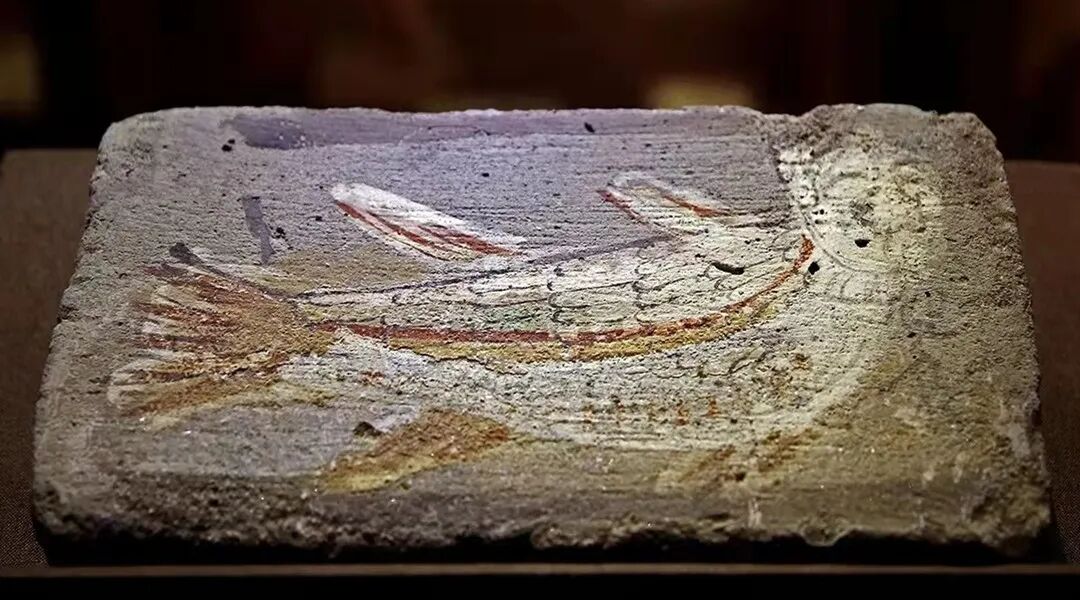 砖有墨线边框,中间彩绘一双翅高展的飞鱼,有鸟爪状的足。画面右上角有“万鳣”两字题记。