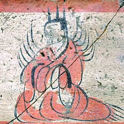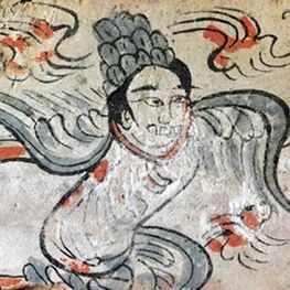 我国古代有天圆地方之称,伏羲执规象征天,女娲执矩象征地,伏羲女娲是远古神话中华夏人文的始祖,相传人类是由伏羲女娲兄妹俩相婚而产生的。他们的造型通常都是人面蛇身,连体交尾,反映了墓主人追随升天的愿望,也期望其后代能够繁衍生息。伏羲女娲为汉魏时期流行于河西地区的神话传说,是河西魏晋墓葬中常见的题材。作为藻井的伏羲女娲图出现较少,十分珍贵。