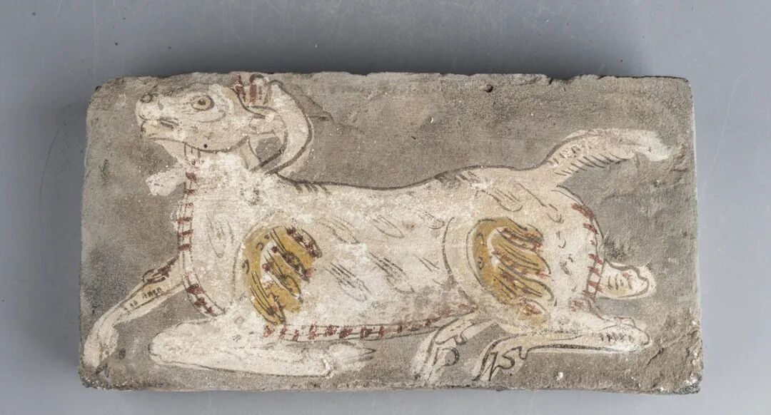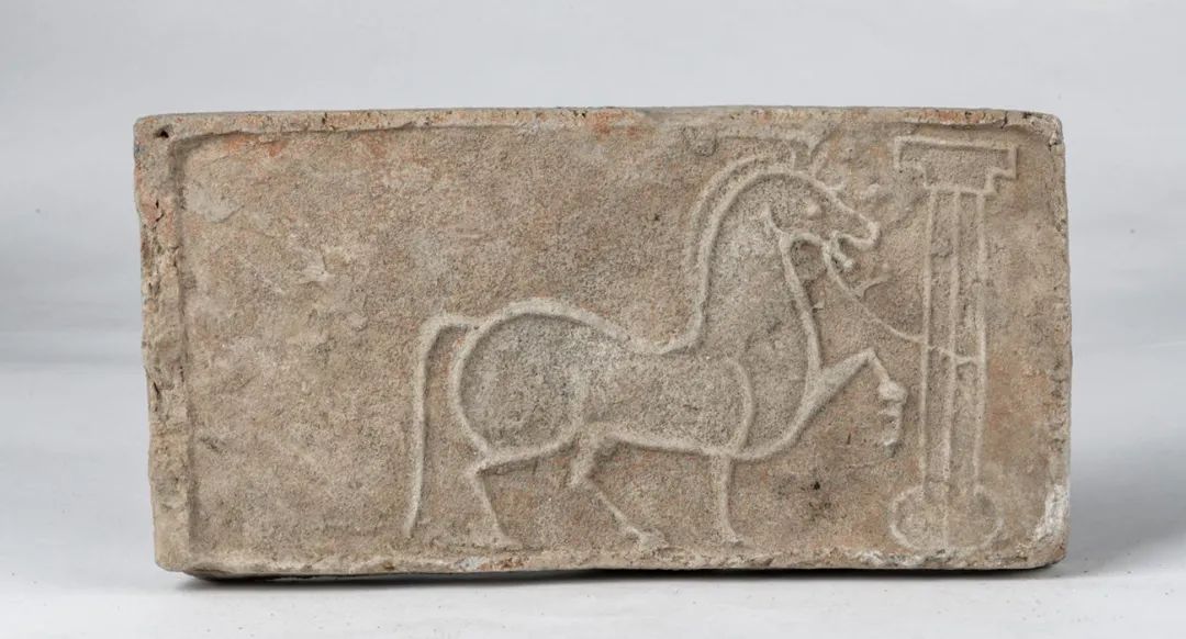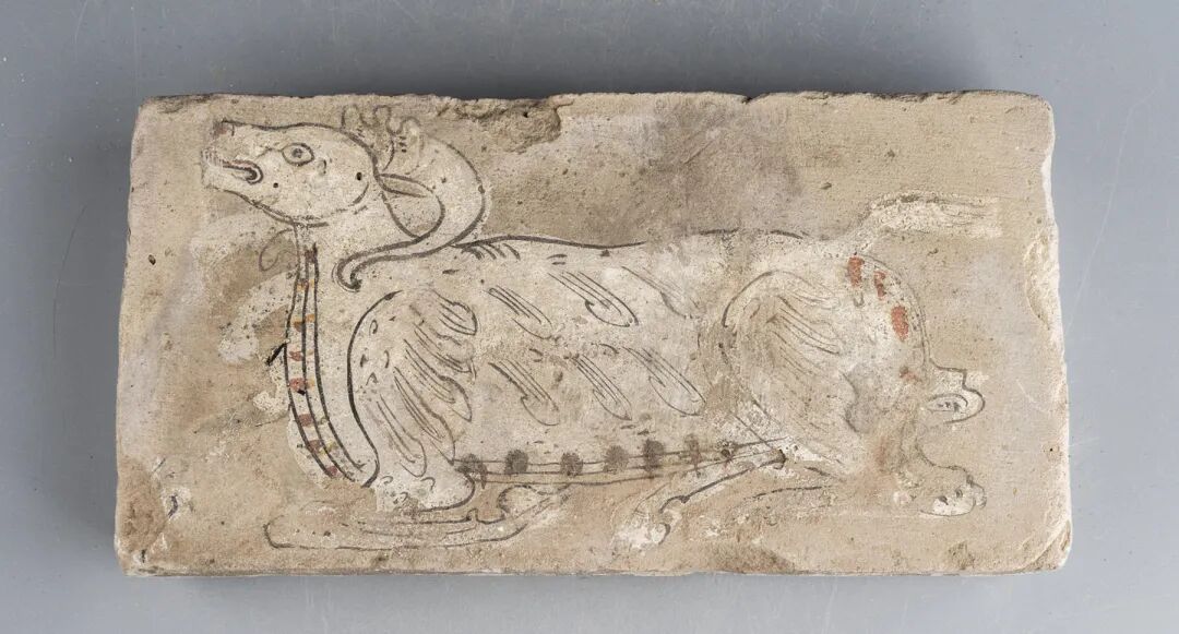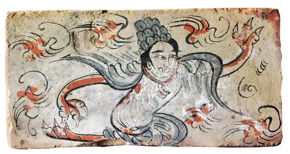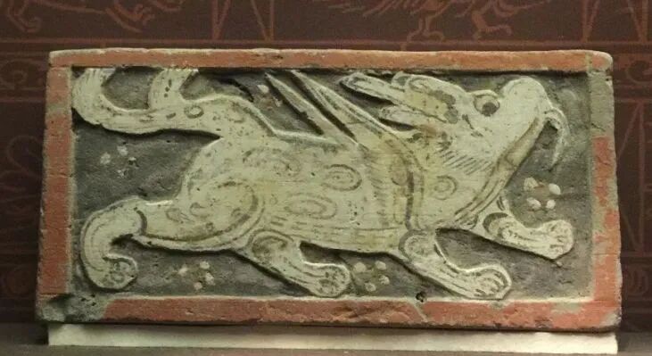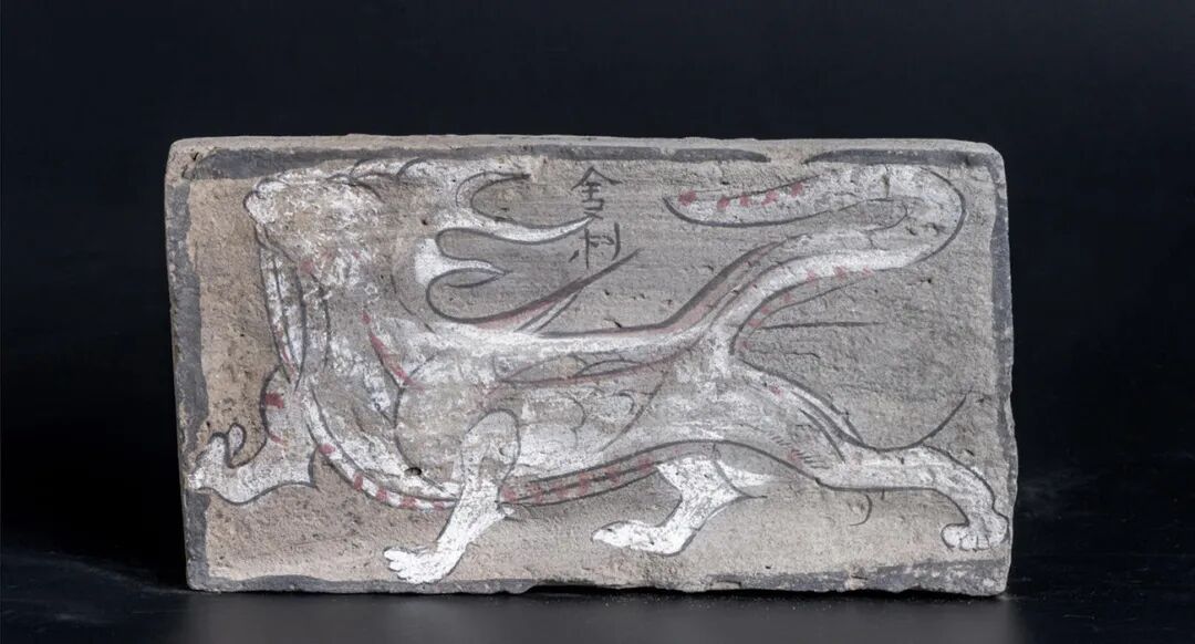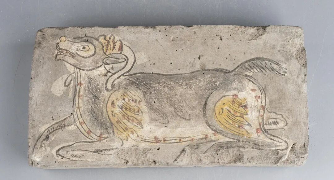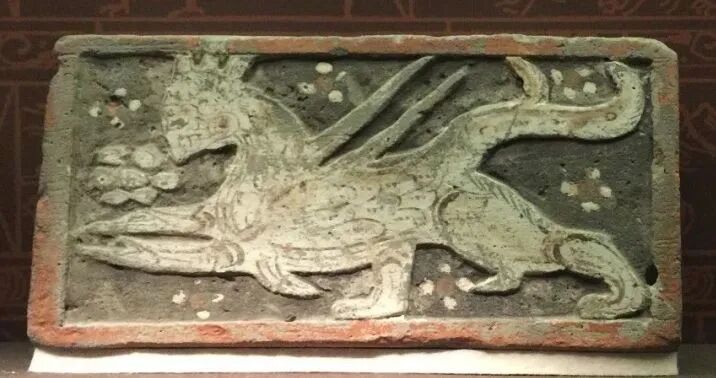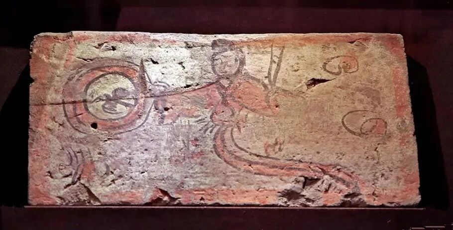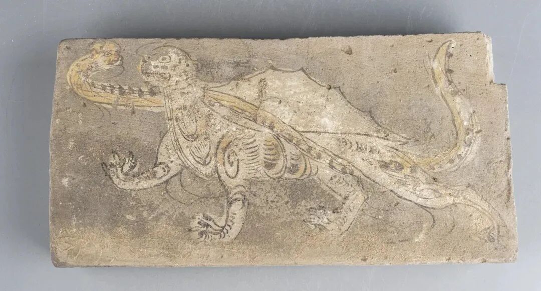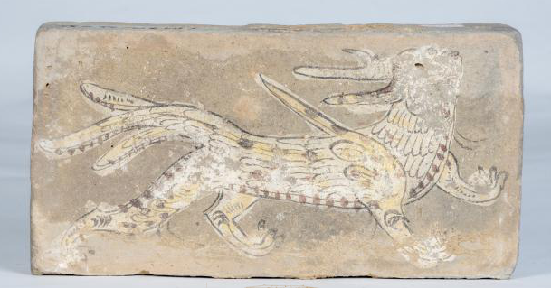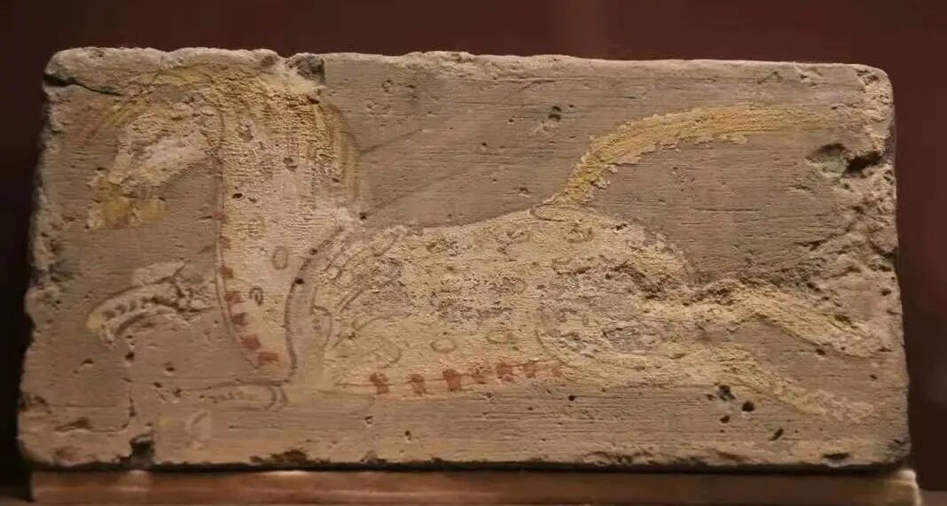 砖上彩绘肩部生翼的神马,色彩明丽,有黄色的垂鬃与尾毛,四肢腾起,蹄作爪状。