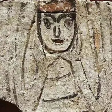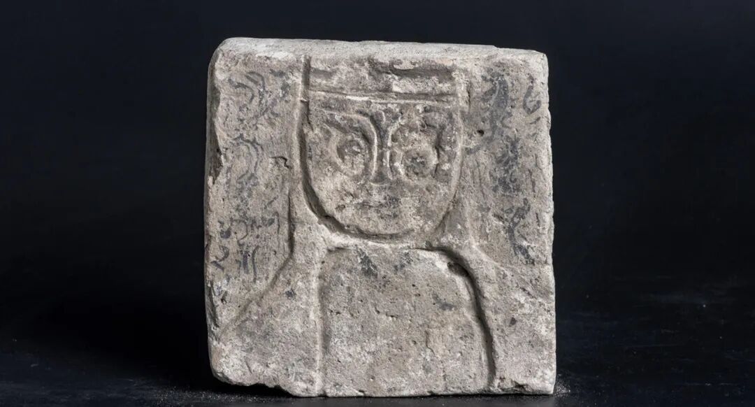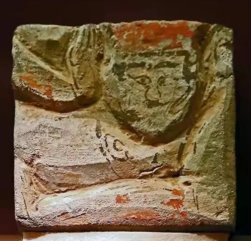 该砖整体呈正方形,正面刻有一人物半身像,此人为方脸、圆目、长鼻,双手托腮,直视前方,为墓主人看守墓门使其不受外界侵扰,人首两侧似绘有奇特纹饰,现已斑驳不清,无法辨识。该砖纹饰雕工简练、粗犷,镶嵌于墓门楼式照墙之上,既起到了装饰效果又有着镇邪驱恶之功效。