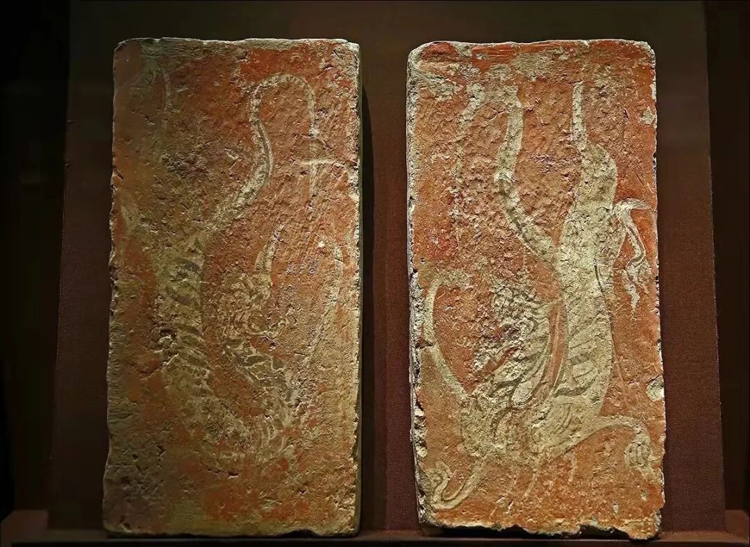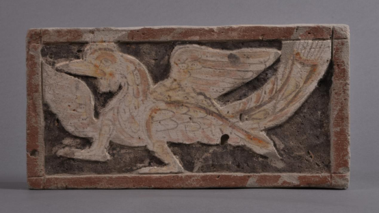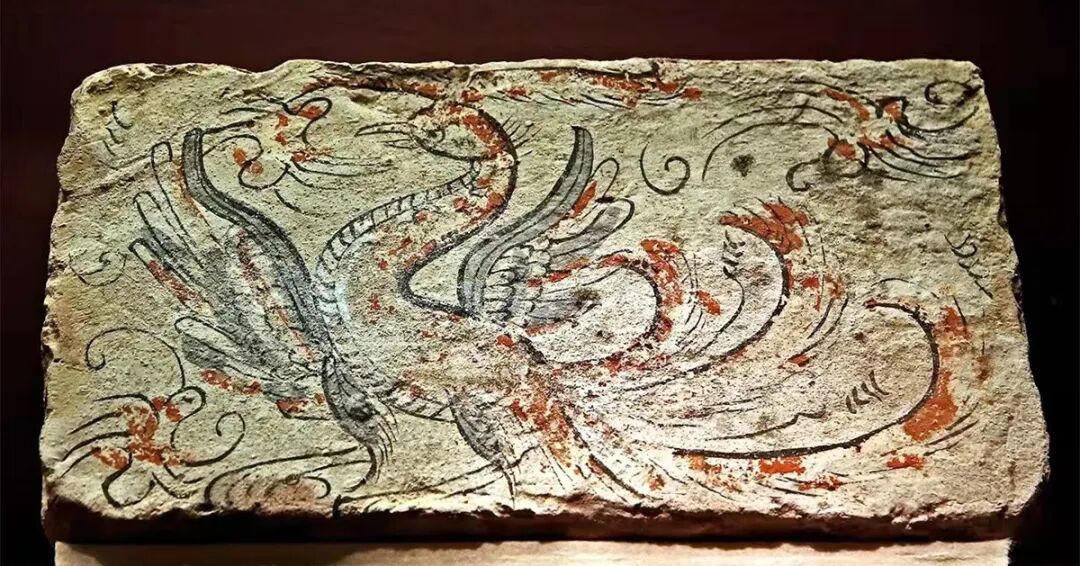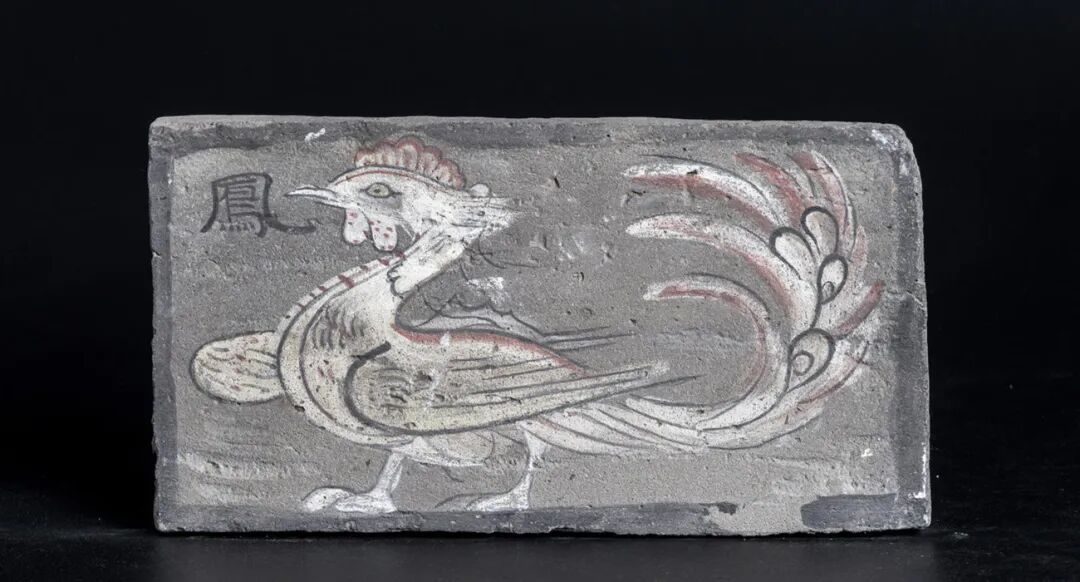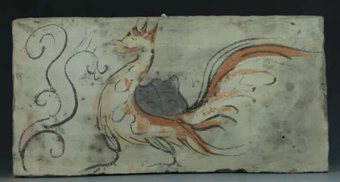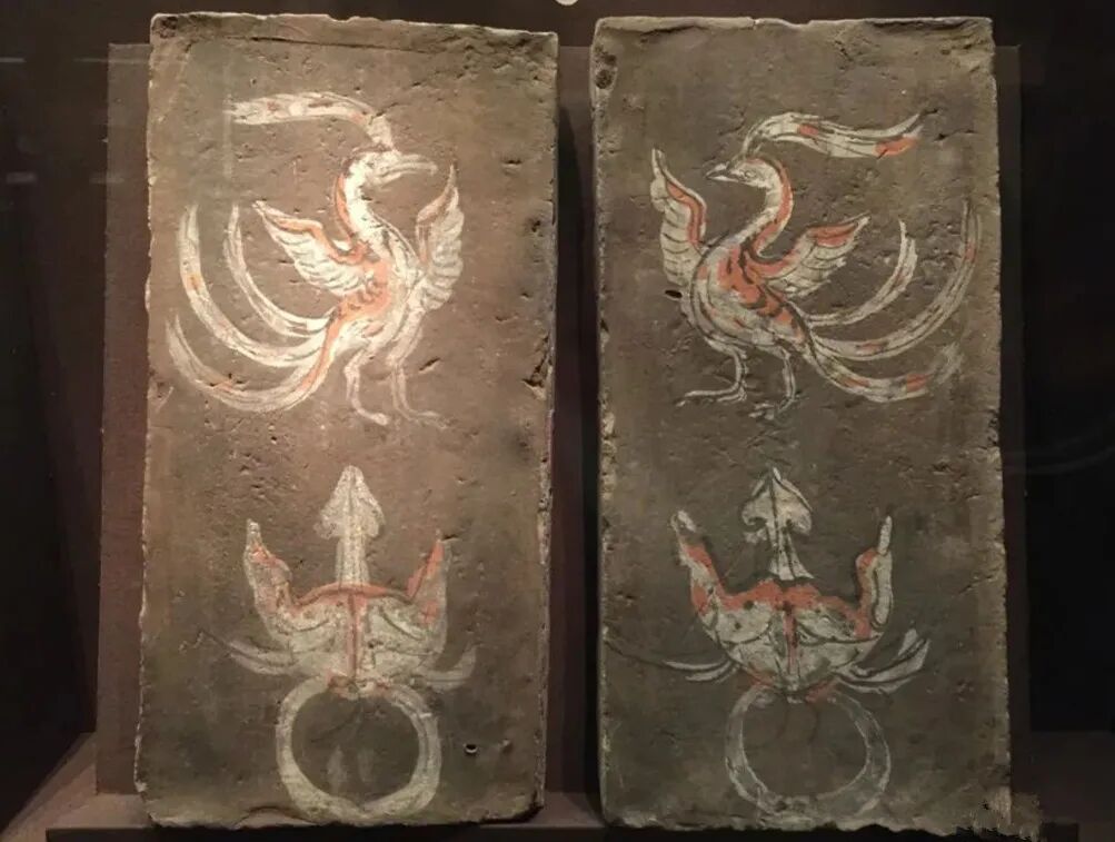 砖上所绘朱雀呈双足直立,行走姿态;头部有孔雀翎,长喙,两侧附有长须,张口作鸣啼状;长颈,双翅张扬,尾部亦带孔雀翎,向上翘起。姿态生动、优雅,极富美感。《楚辞》记载:“飞朱鸟使先驱兮,驾太一之象舆”,《山海经》记载:“有鸟焉,其状如鸡,五采而文……见则天下安宁。”朱雀常被视为祥和安宁的象征,其作为神山仙境的神鸟,也被用于象征天国仙境。